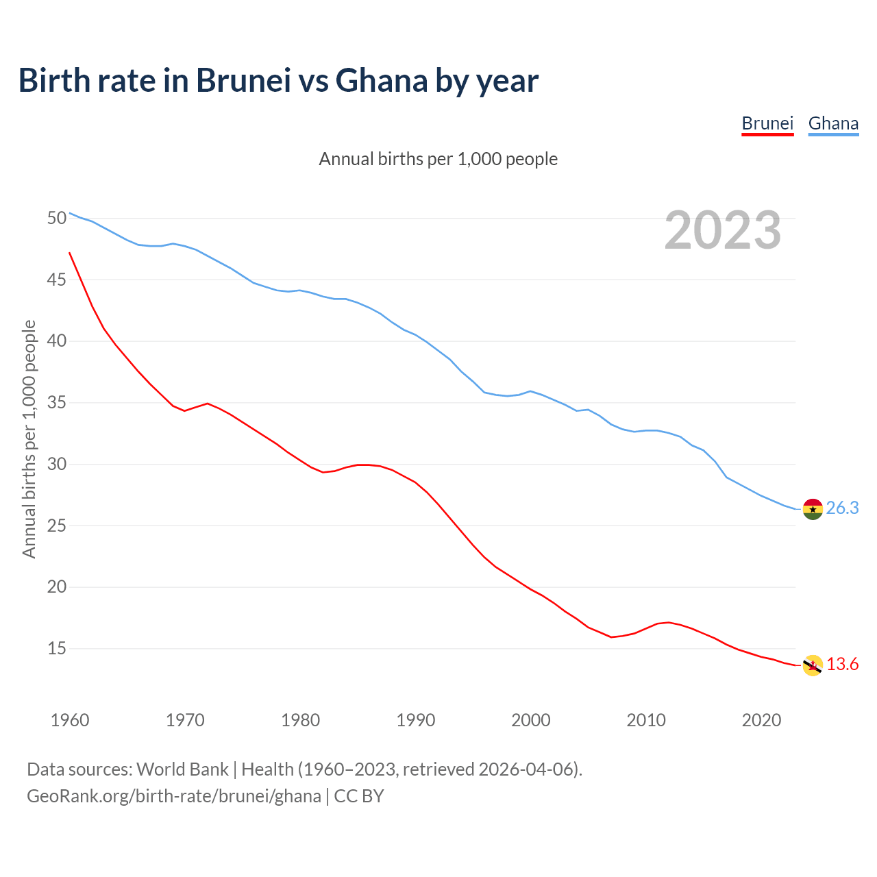 Brunei has an annual birth rate of 13.6 births per 1,000 people, compared to 26.3 for Ghana. The average number of children a woman is expected to have during her lifetime — the fertility rate, is 1.75 in Brunei and 3.4 in Ghana — 94.4% difference.