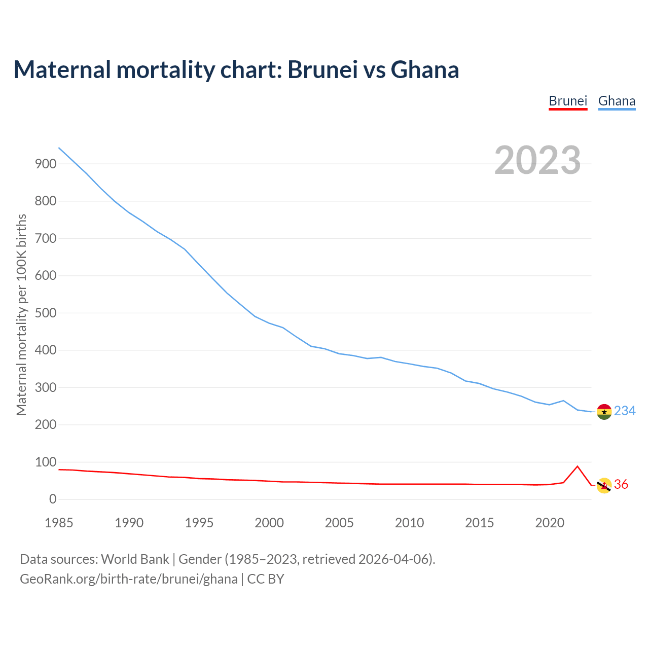 The maternal mortality rate, which is the probability of dying during childbirth or within 42 days of pregnancy termination, is 36 deaths per 100,000 live births in Brunei, compared to 234 deaths in Ghana.