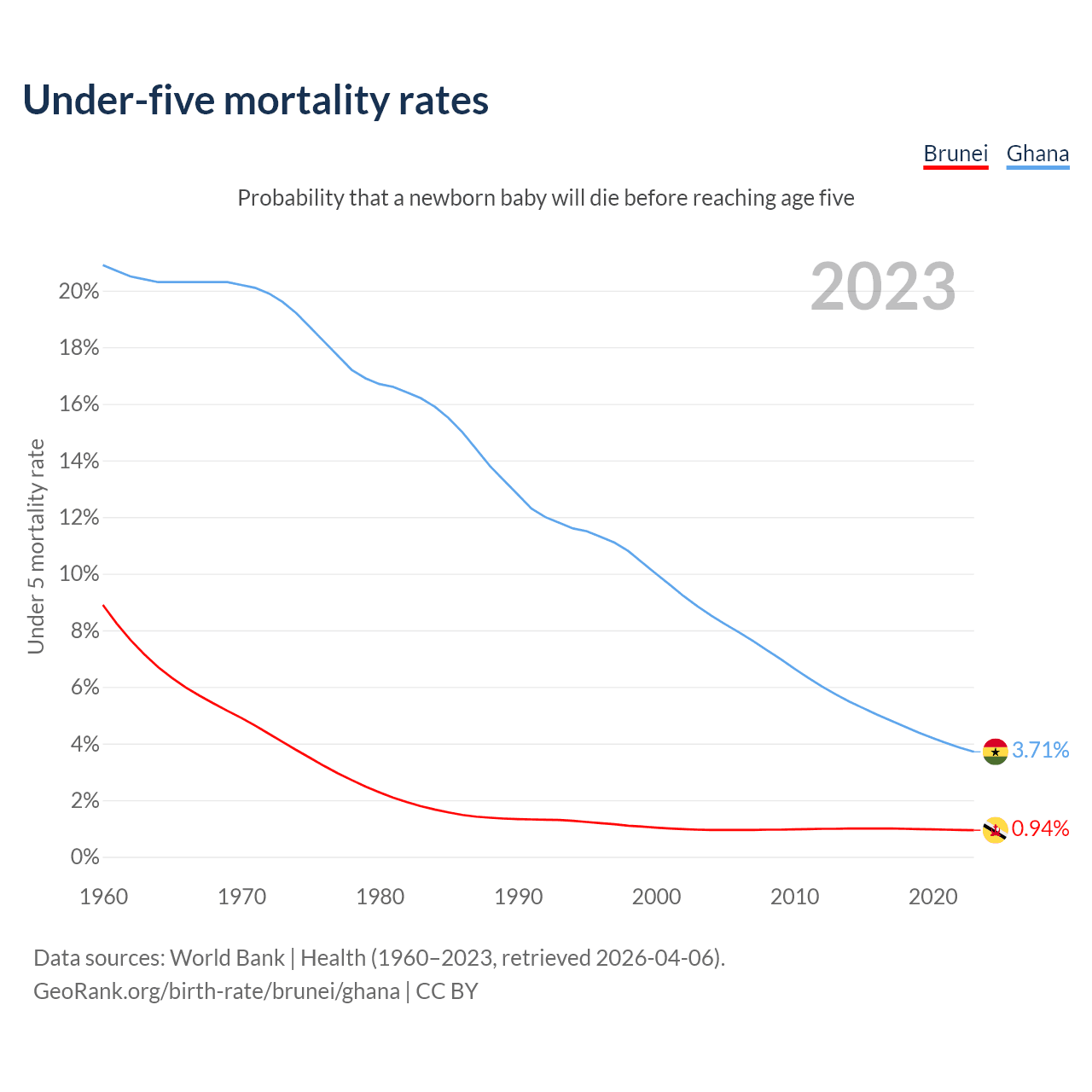 The chance that a newborn baby will die before reaching age five is 0.94% in Brunei and 3.71% in Ghana. Above is a chart with historical data on under-five mortality rates.
