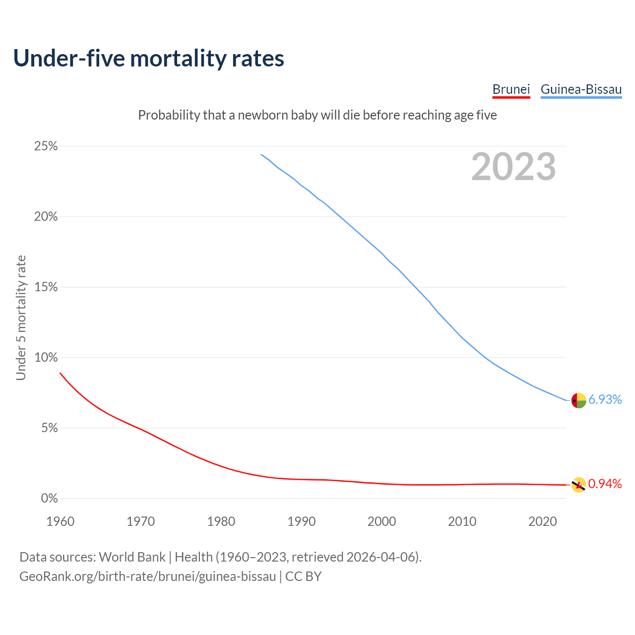 The chance that a newborn baby will die before reaching age five is 0.94% in Brunei and 6.93% in Guinea-Bissau. Above is a chart with historical data on under-five mortality rates.