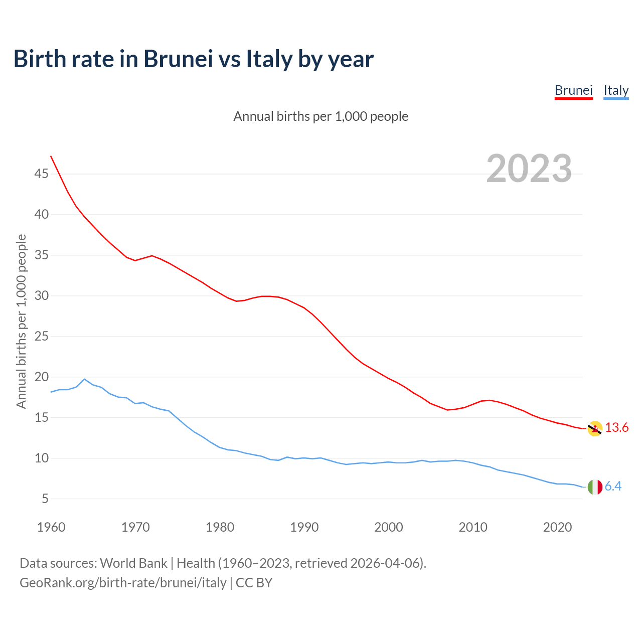 Brunei has an annual birth rate of 13.6 births per 1,000 people, compared to 6.4 for Italy. The average number of children a woman is expected to have during her lifetime — the fertility rate, is 1.75 in Brunei and 1.2 in Italy — 31.3% difference.