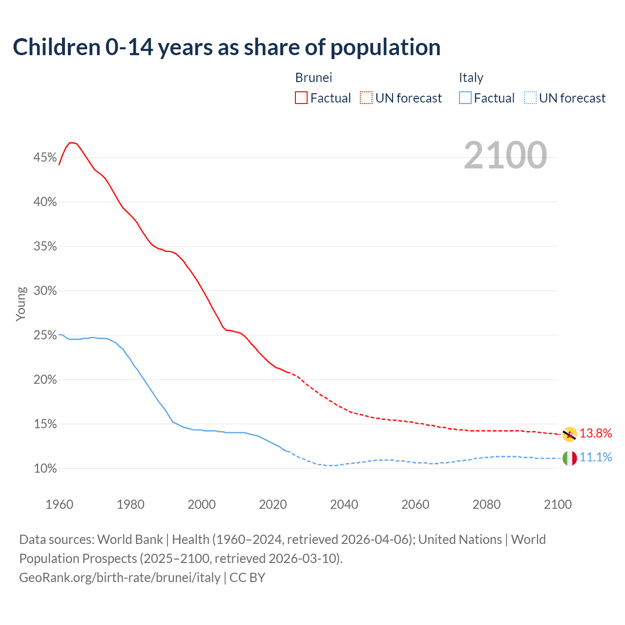 According to the latest available data on birth rates, the fertility rate in Brunei was 1.75 children per woman in 2023, compared to 1.2 in Italy in 2023. The replacement level is considered to be 2.1 children per woman.