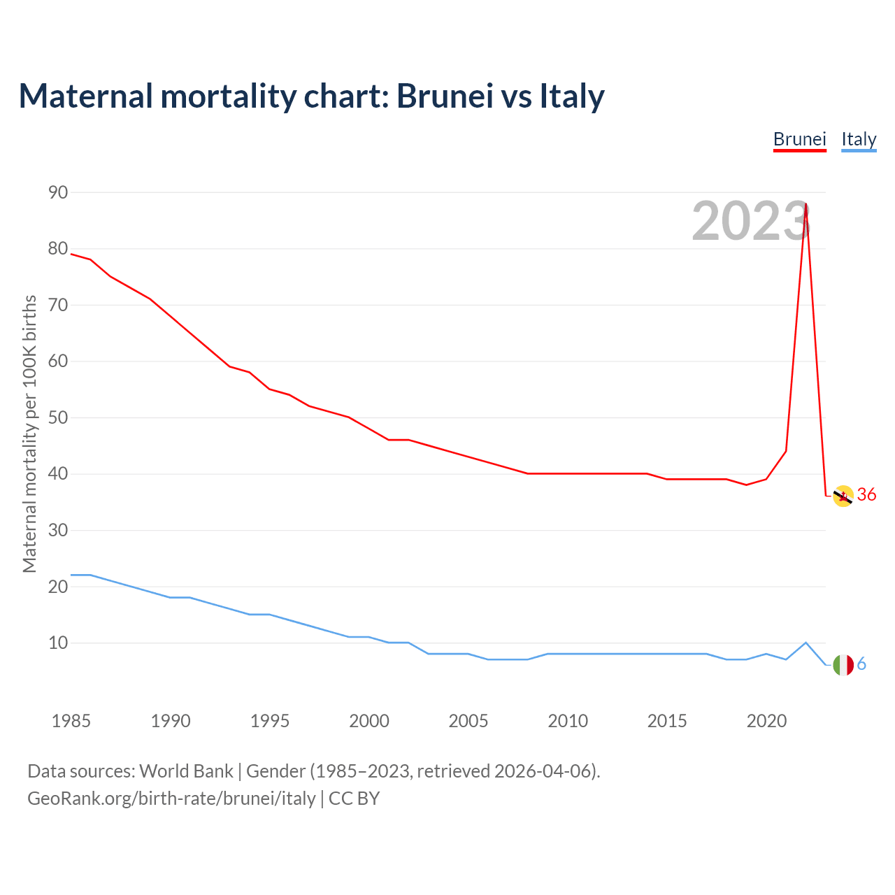 The maternal mortality rate, which is the probability of dying during childbirth or within 42 days of pregnancy termination, is 36 deaths per 100,000 live births in Brunei, compared to 6 deaths in Italy.