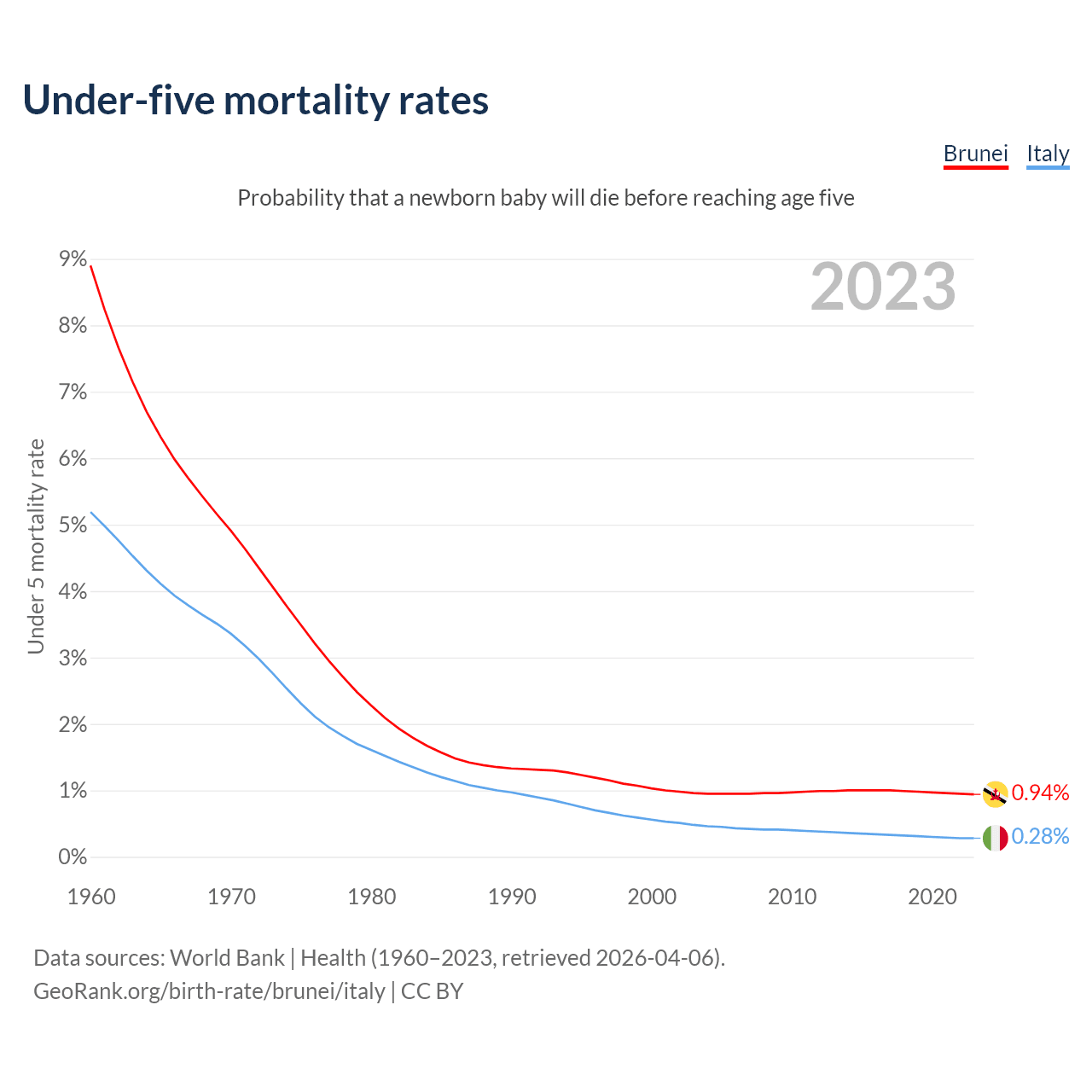 The chance that a newborn baby will die before reaching age five is 0.94% in Brunei and 0.28% in Italy. Above is a chart with historical data on under-five mortality rates.