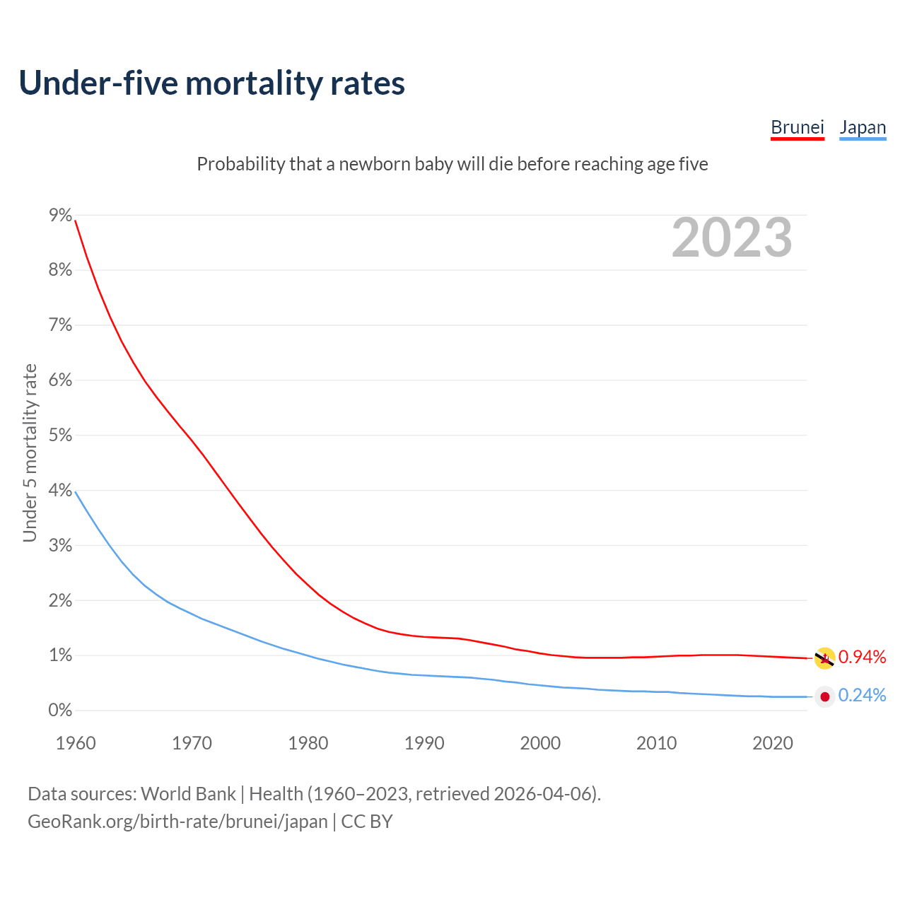 The chance that a newborn baby will die before reaching age five is 0.94% in Brunei and 0.24% in Japan. Above is a chart with historical data on under-five mortality rates.