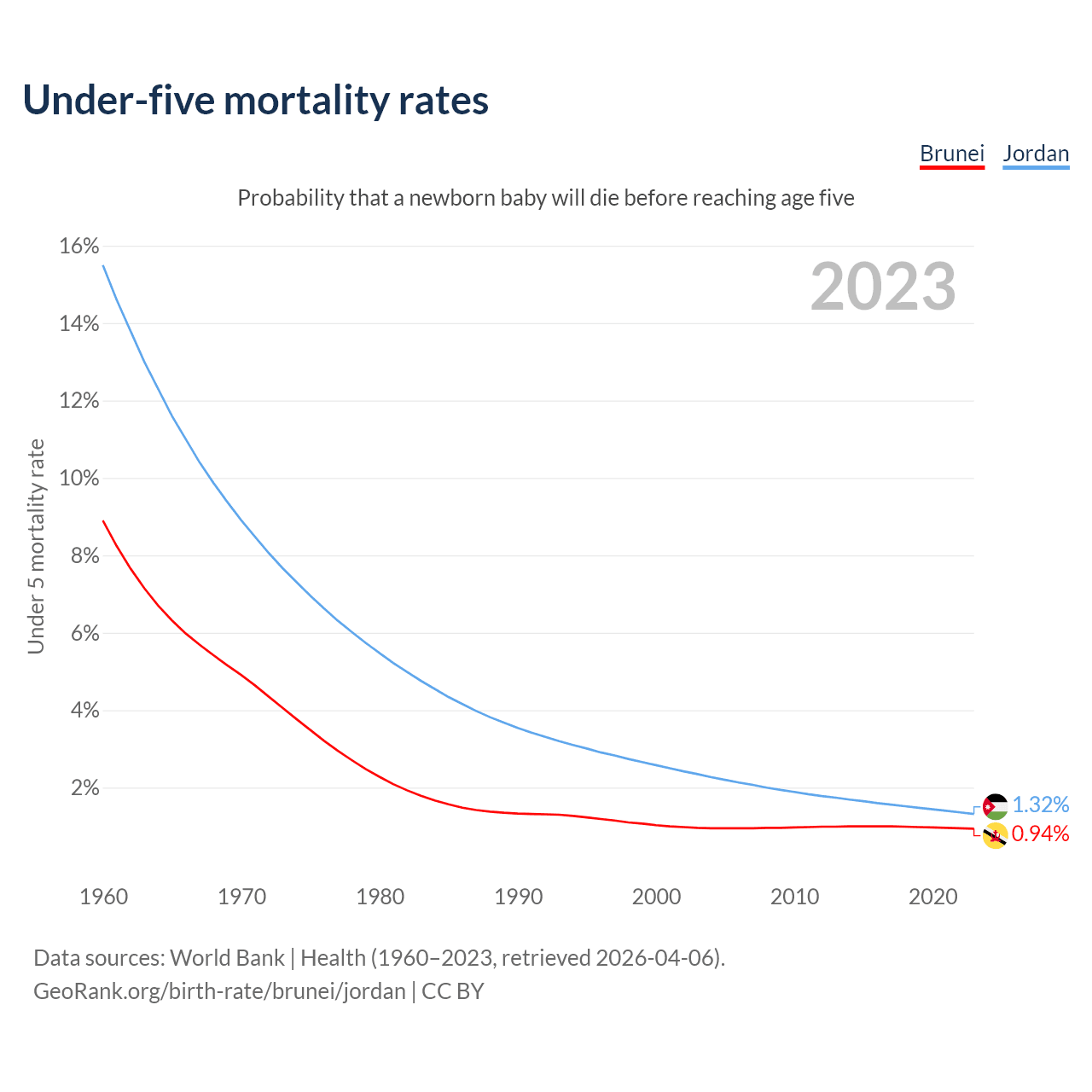 The chance that a newborn baby will die before reaching age five is 0.94% in Brunei and 1.32% in Jordan. Above is a chart with historical data on under-five mortality rates.