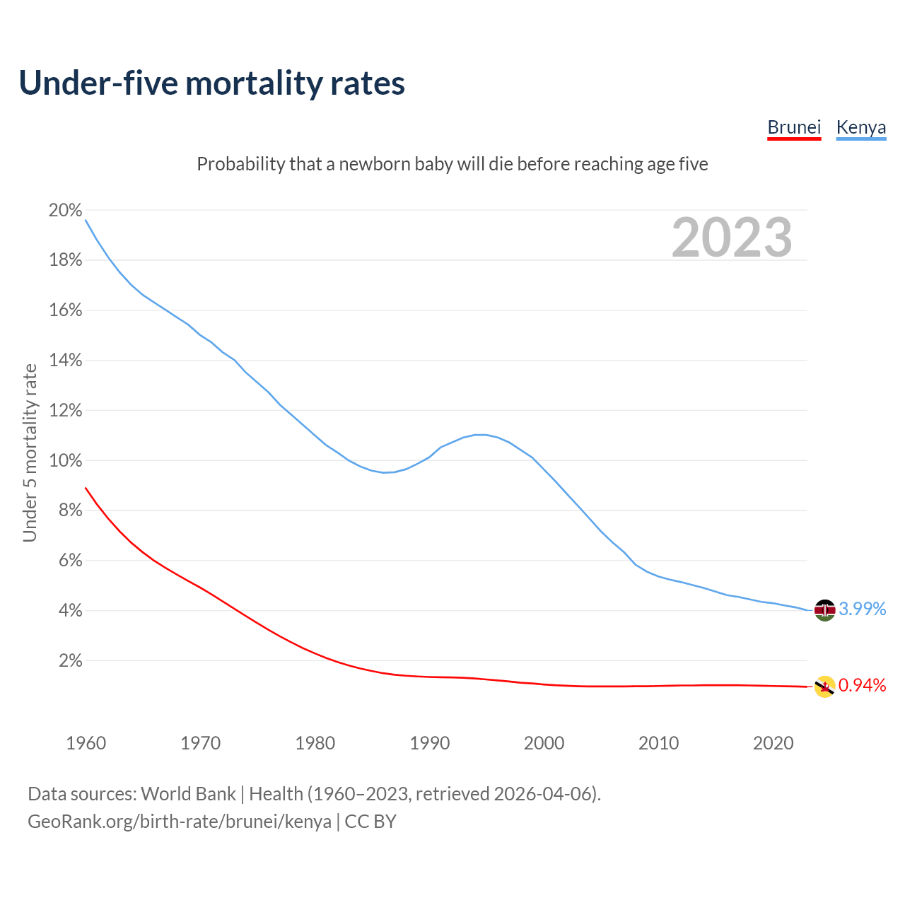 The chance that a newborn baby will die before reaching age five is 0.94% in Brunei and 3.99% in Kenya. Above is a chart with historical data on under-five mortality rates.
