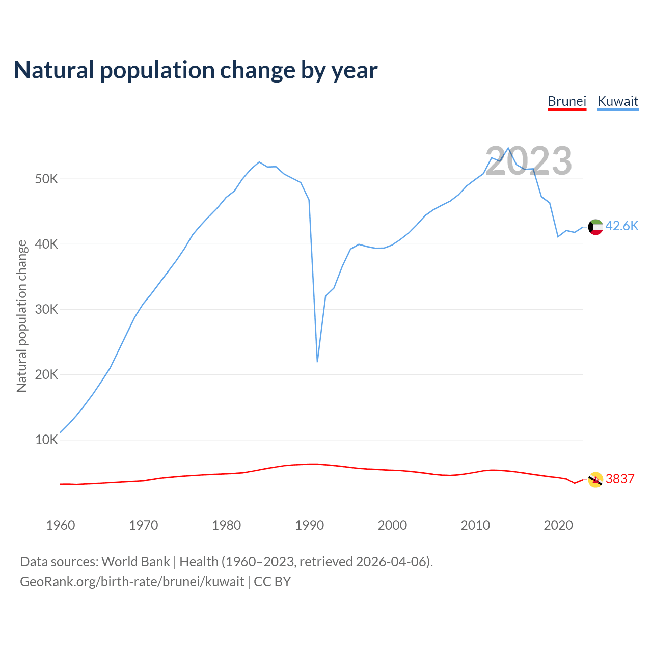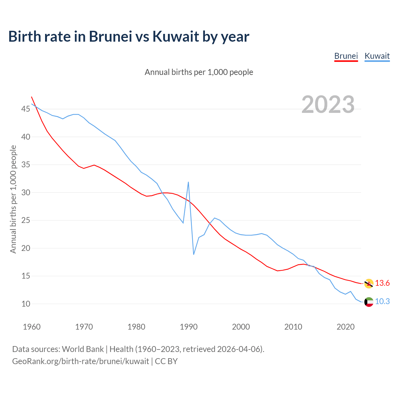 Brunei has an annual birth rate of 13.6 births per 1,000 people, compared to 10.3 for Kuwait. The average number of children a woman is expected to have during her lifetime — the fertility rate, is 1.75 in Brunei and 1.52 in Kuwait — 12.8% difference.