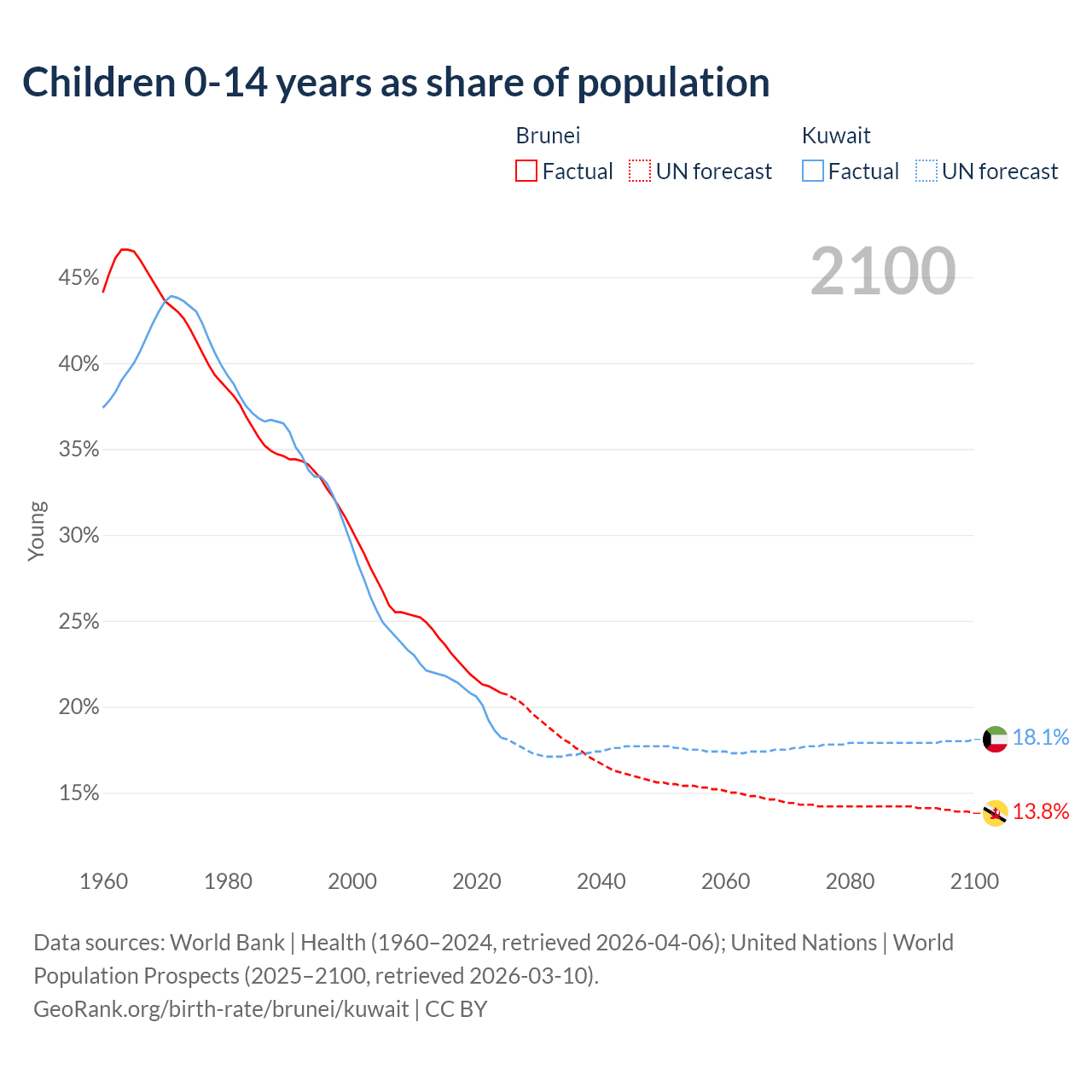 According to the latest available data on birth rates, the fertility rate in Brunei was 1.75 children per woman in 2023, compared to 1.52 in Kuwait in 2023. The replacement level is considered to be 2.1 children per woman.