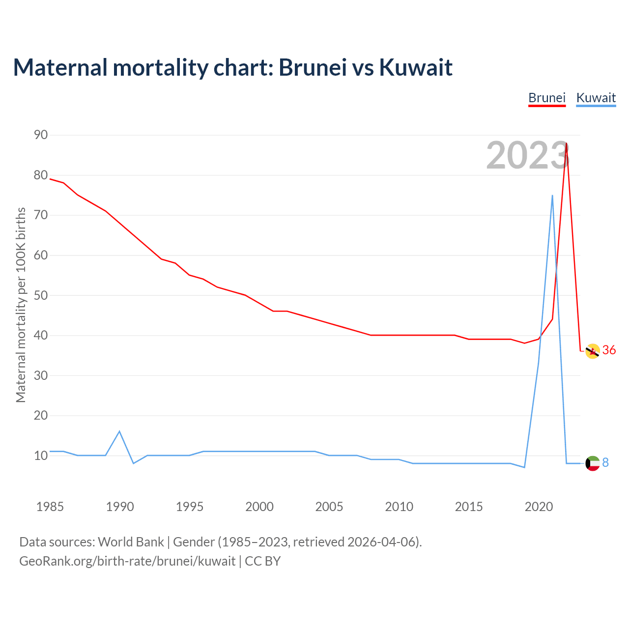 The maternal mortality rate, which is the probability of dying during childbirth or within 42 days of pregnancy termination, is 36 deaths per 100,000 live births in Brunei, compared to 8 deaths in Kuwait.