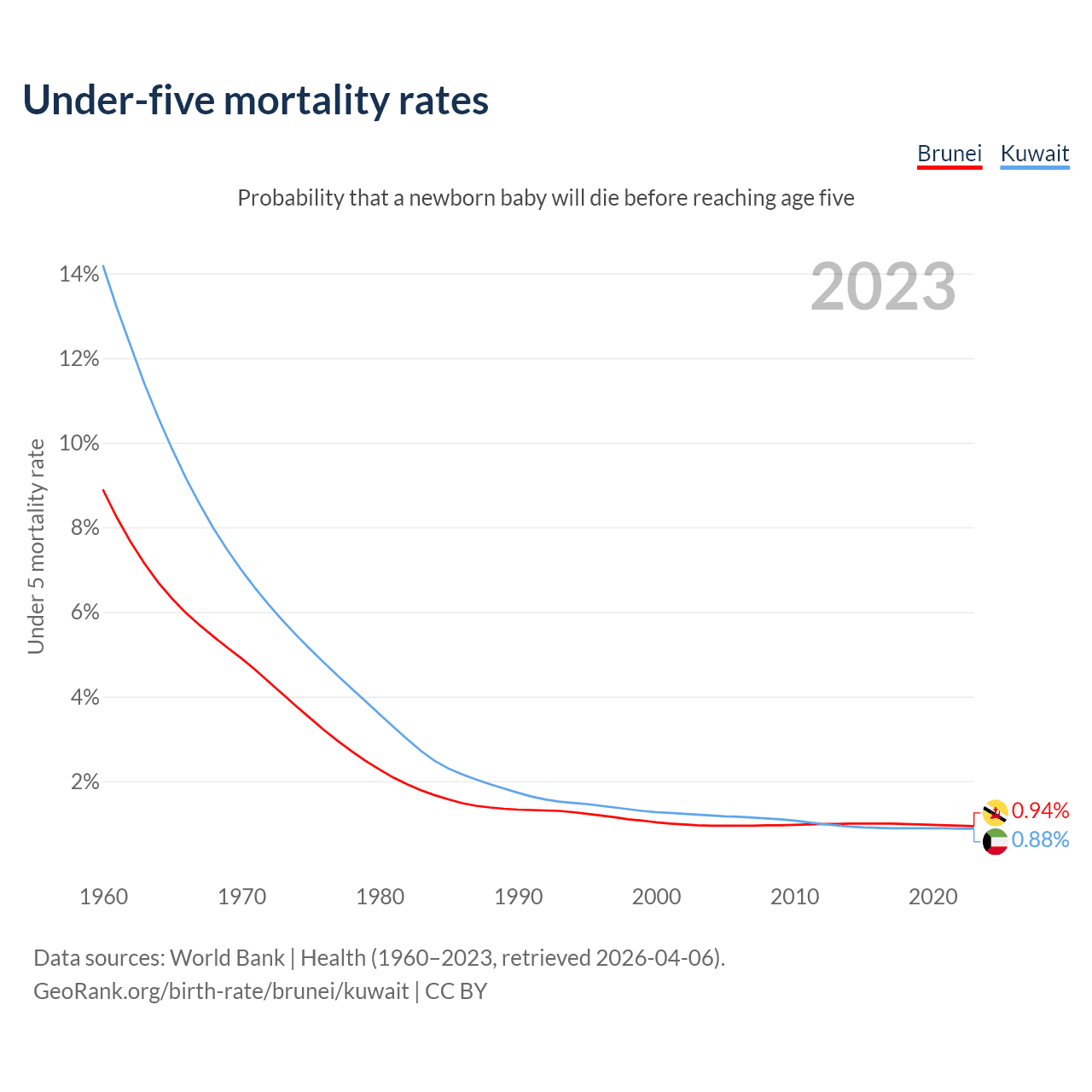 The chance that a newborn baby will die before reaching age five is 0.94% in Brunei and 0.88% in Kuwait. Above is a chart with historical data on under-five mortality rates.