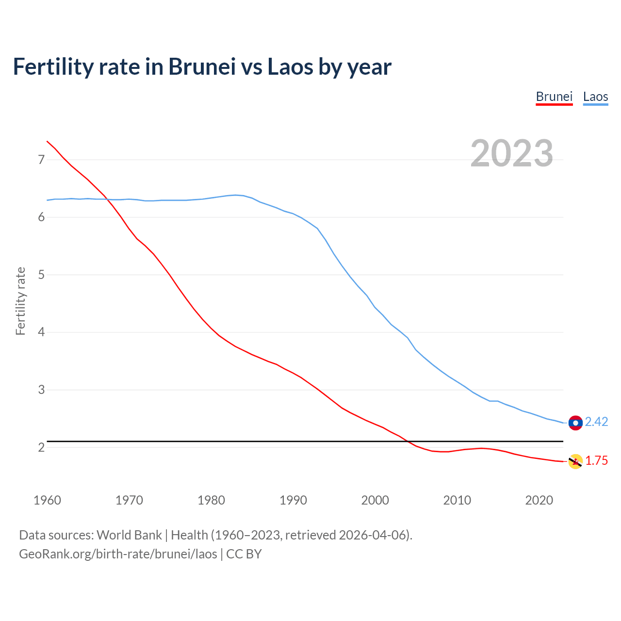 According to the latest available data on birth rates, the fertility rate in Brunei was 1.75 children per woman in 2023, compared to 2.42 in Laos in 2023. The replacement level is considered to be 2.1 children per woman.