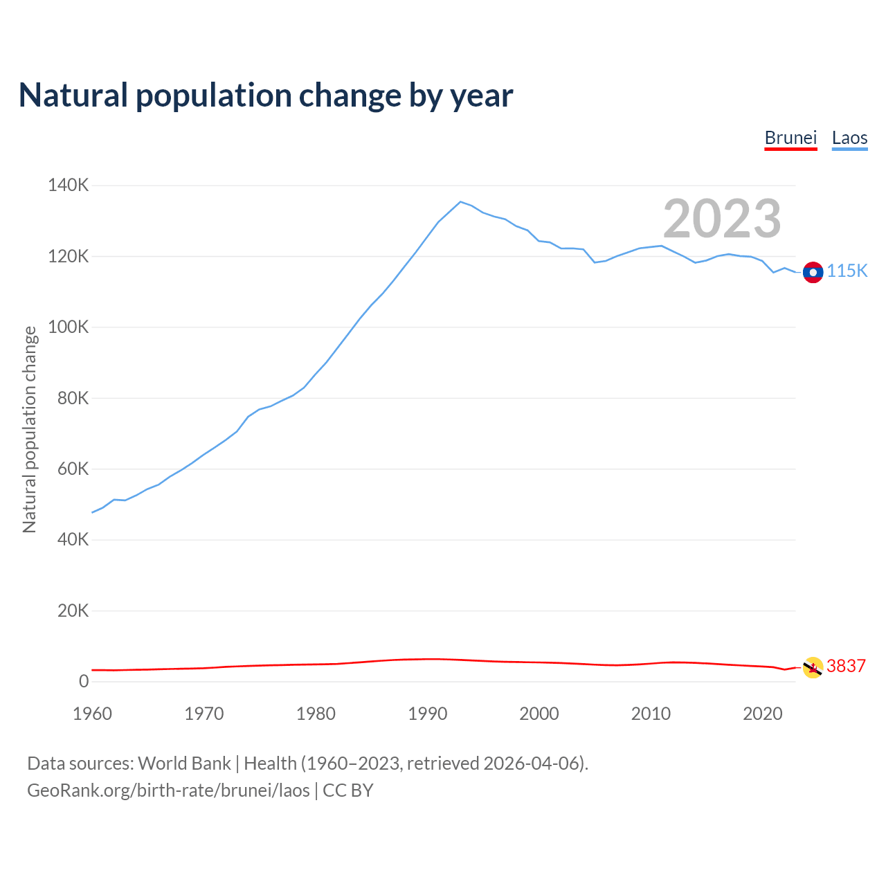 Brunei has an annual birth rate of 13.6 births per 1,000 people, compared to 21.3 for Laos. The average number of children a woman is expected to have during her lifetime — the fertility rate, is 1.75 in Brunei and 2.42 in Laos — 38.6% difference.