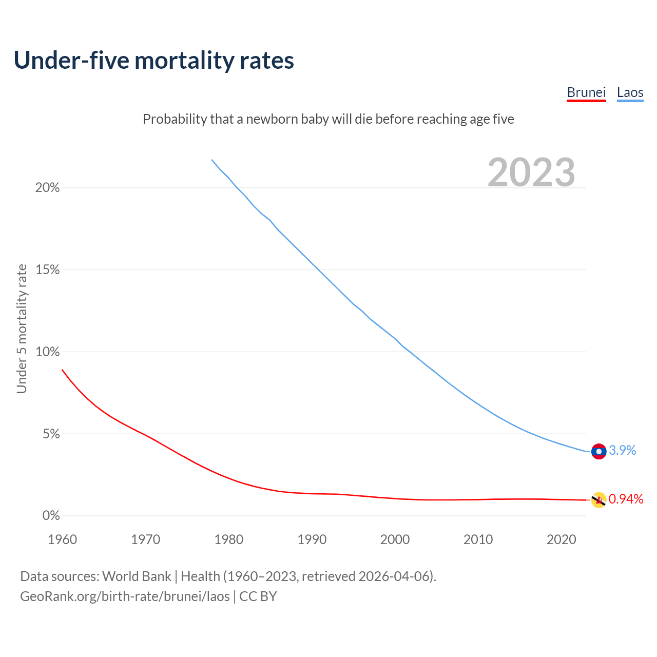The chance that a newborn baby will die before reaching age five is 0.94% in Brunei and 3.9% in Laos. Above is a chart with historical data on under-five mortality rates.