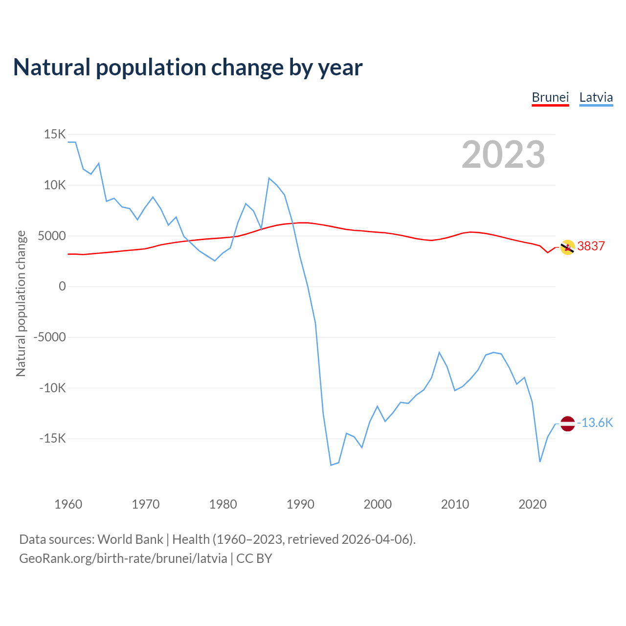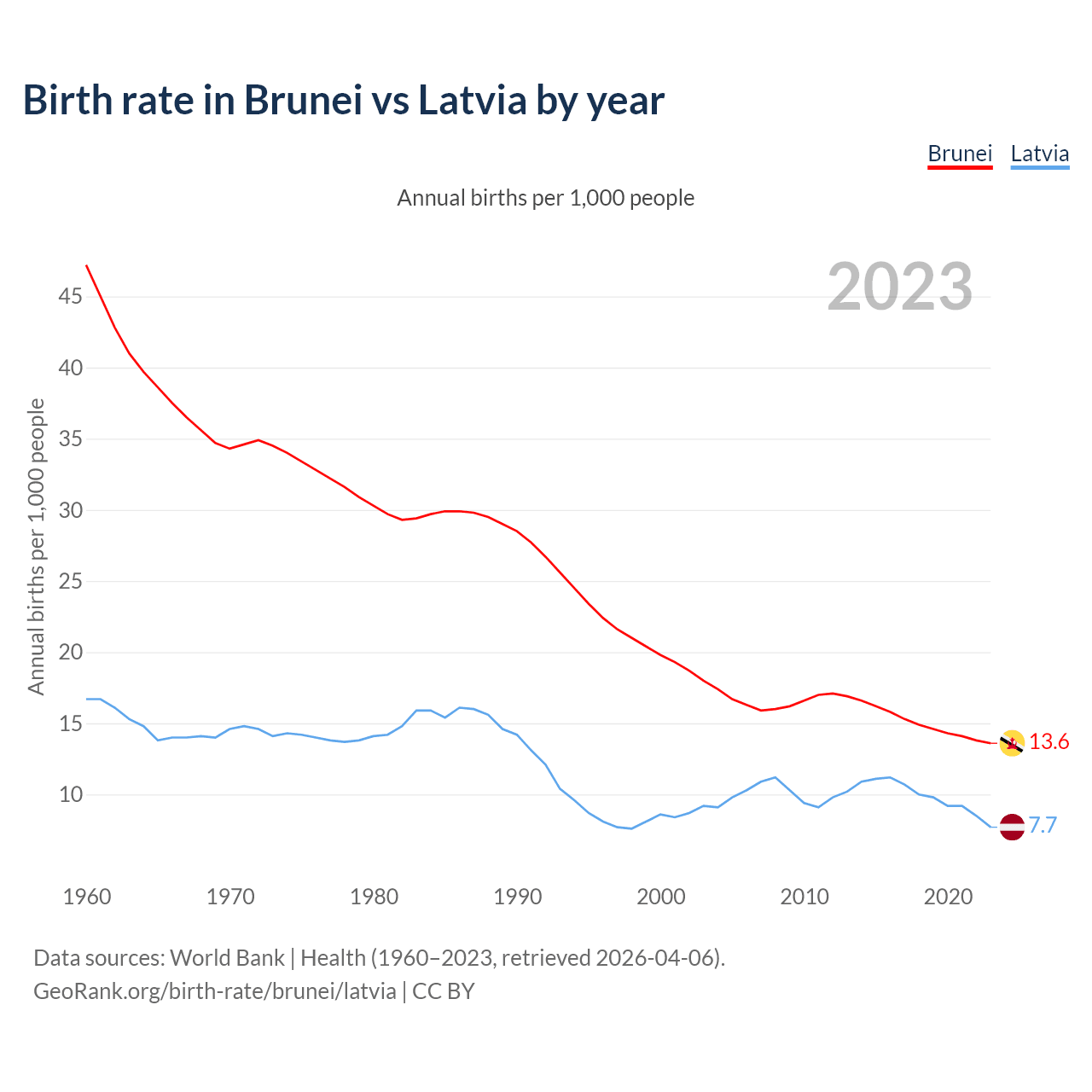 Brunei has an annual birth rate of 13.6 births per 1,000 people, compared to 7.7 for Latvia. The average number of children a woman is expected to have during her lifetime — the fertility rate, is 1.75 in Brunei and 1.36 in Latvia — 22.2% difference.