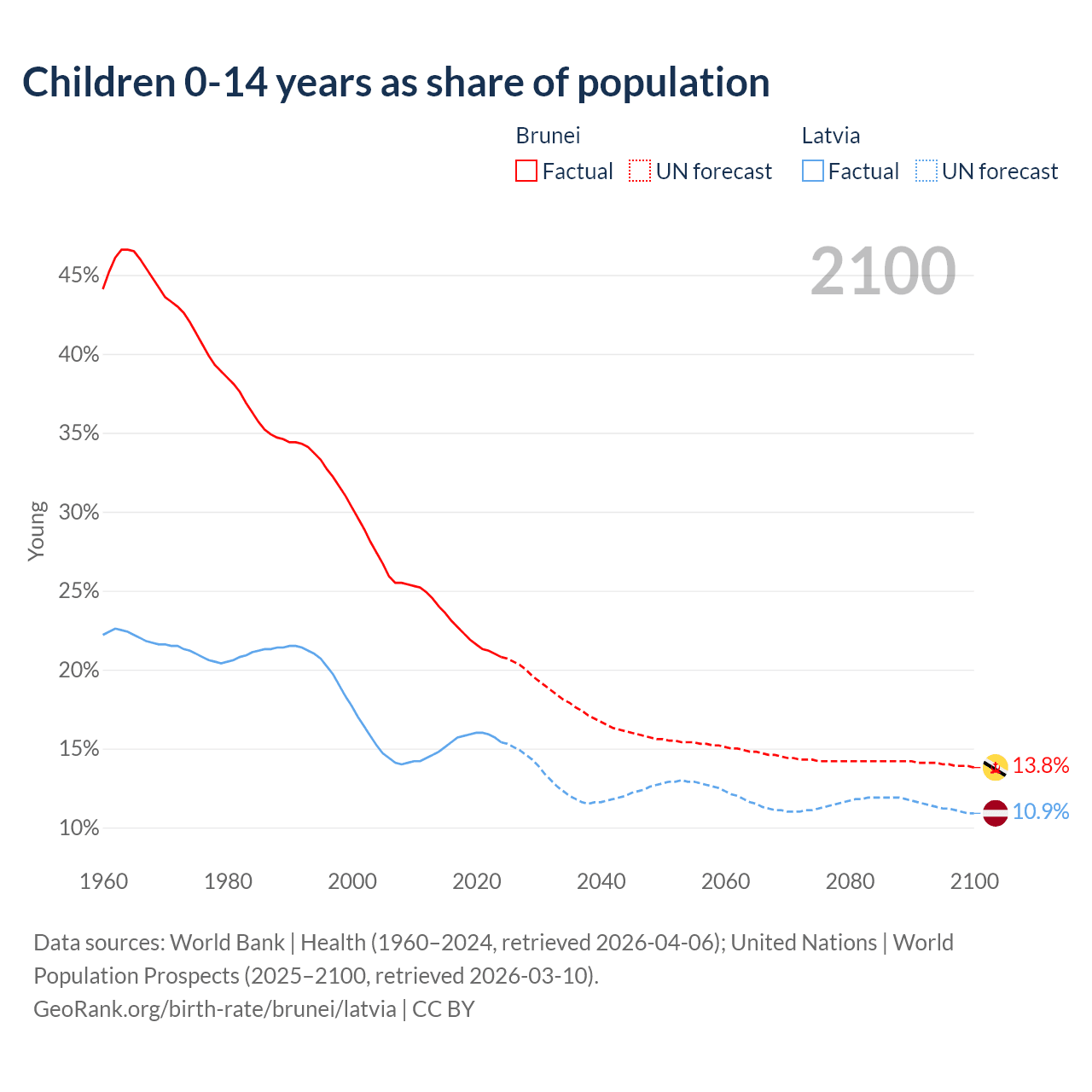 According to the latest available data on birth rates, the fertility rate in Brunei was 1.75 children per woman in 2023, compared to 1.36 in Latvia in 2023. The replacement level is considered to be 2.1 children per woman.