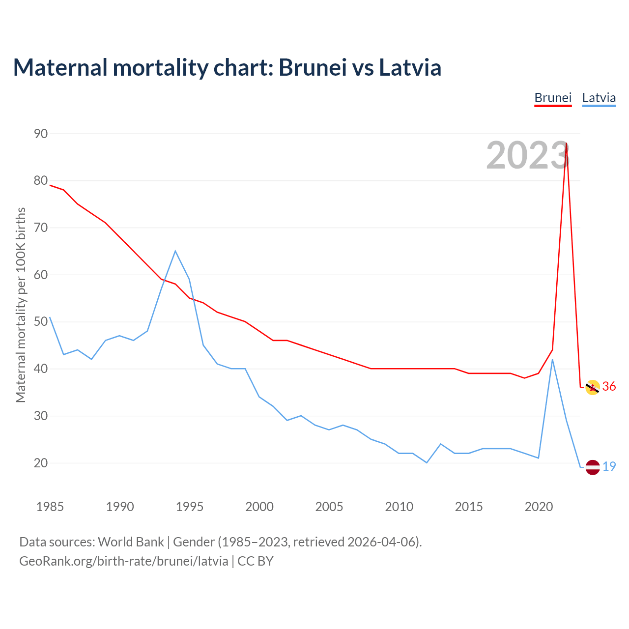 The maternal mortality rate, which is the probability of dying during childbirth or within 42 days of pregnancy termination, is 36 deaths per 100,000 live births in Brunei, compared to 19 deaths in Latvia.