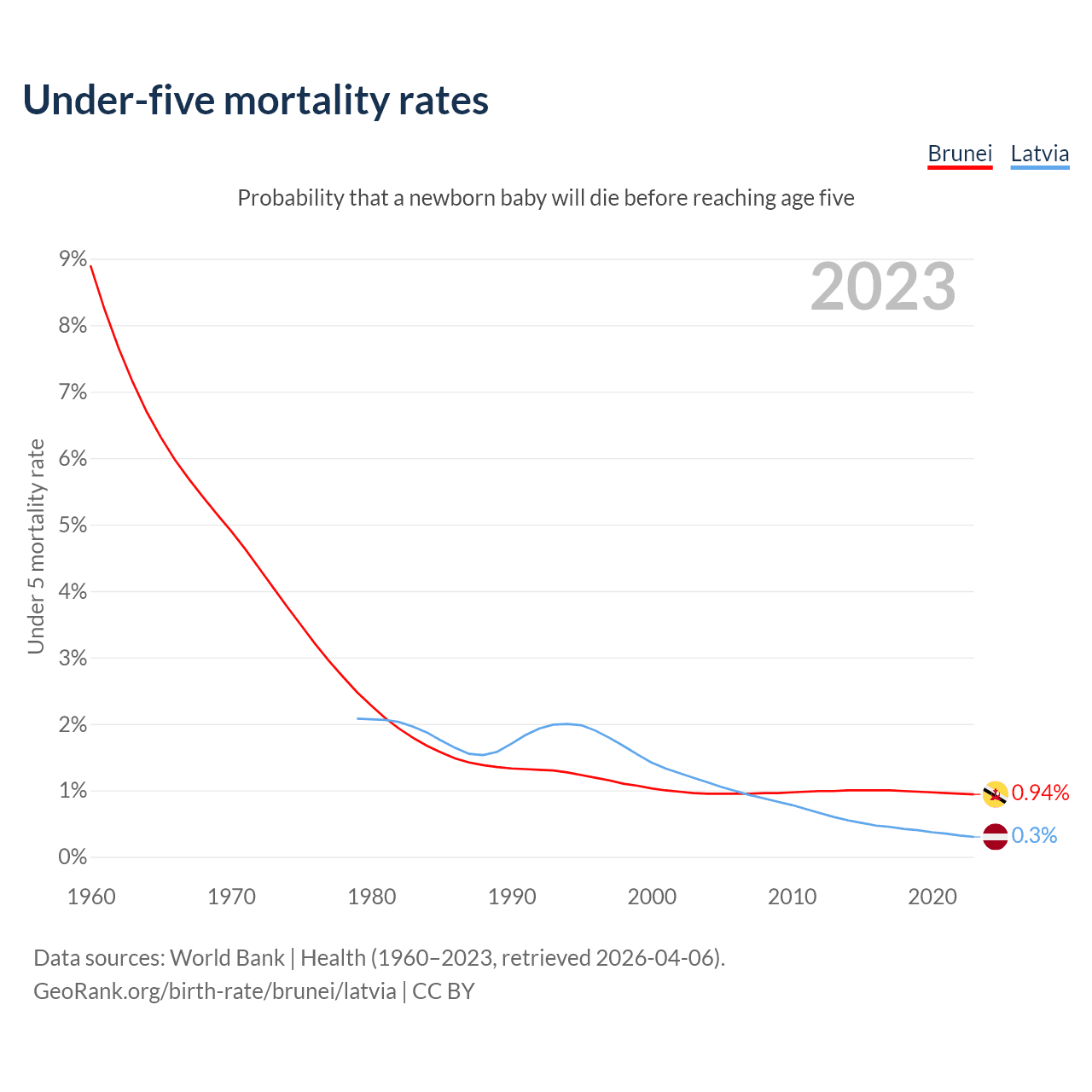 The chance that a newborn baby will die before reaching age five is 0.94% in Brunei and 0.3% in Latvia. Above is a chart with historical data on under-five mortality rates.