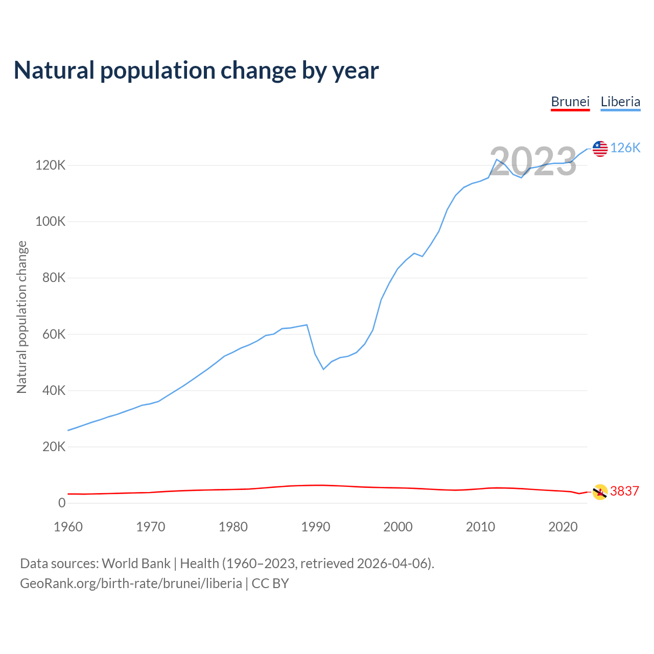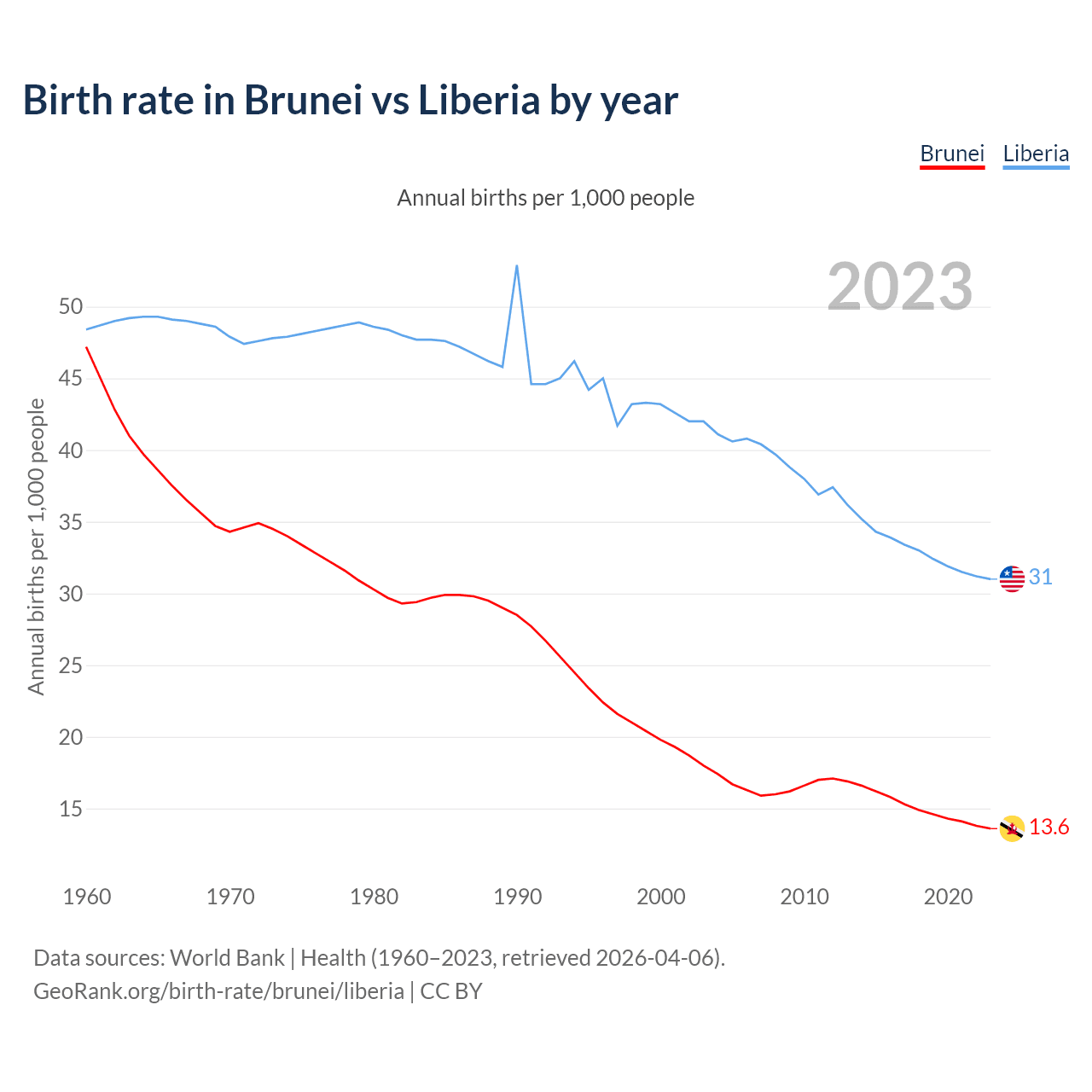 Brunei has an annual birth rate of 13.6 births per 1,000 people, compared to 31 for Liberia. The average number of children a woman is expected to have during her lifetime — the fertility rate, is 1.75 in Brunei and 3.95 in Liberia — 126.1% difference.