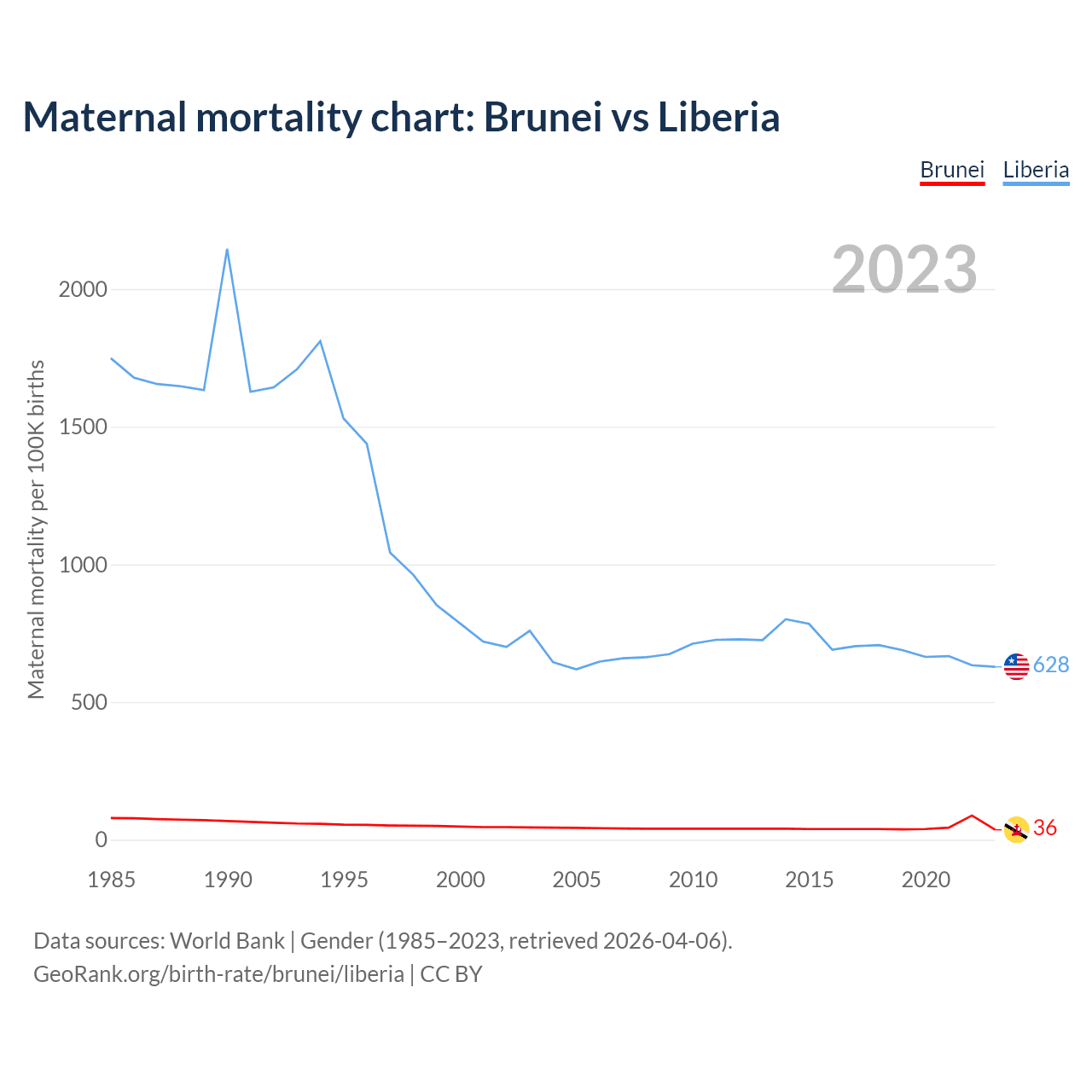 The maternal mortality rate, which is the probability of dying during childbirth or within 42 days of pregnancy termination, is 36 deaths per 100,000 live births in Brunei, compared to 628 deaths in Liberia.