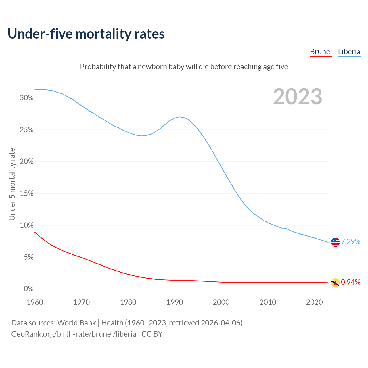 The chance that a newborn baby will die before reaching age five is 0.94% in Brunei and 7.29% in Liberia. Above is a chart with historical data on under-five mortality rates.