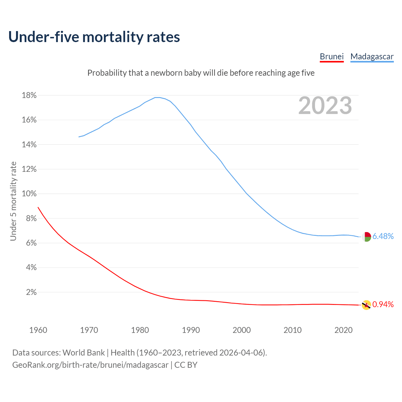 The chance that a newborn baby will die before reaching age five is 0.94% in Brunei and 6.48% in Madagascar. Above is a chart with historical data on under-five mortality rates.