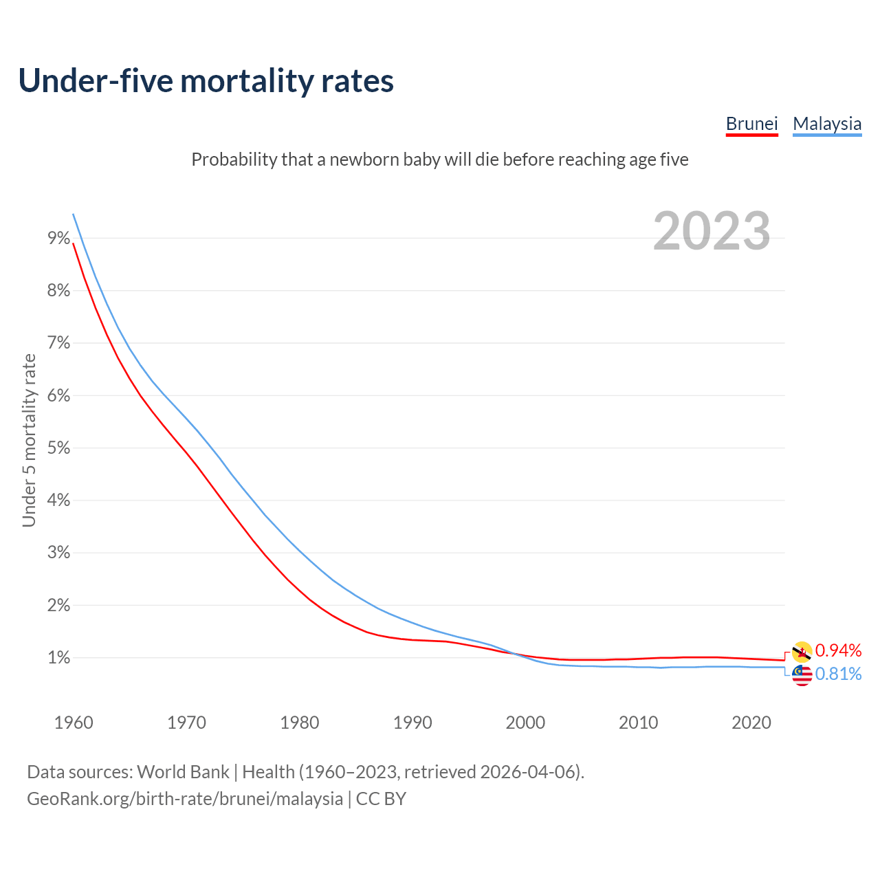 The chance that a newborn baby will die before reaching age five is 0.94% in Brunei and 0.81% in Malaysia. Above is a chart with historical data on under-five mortality rates.