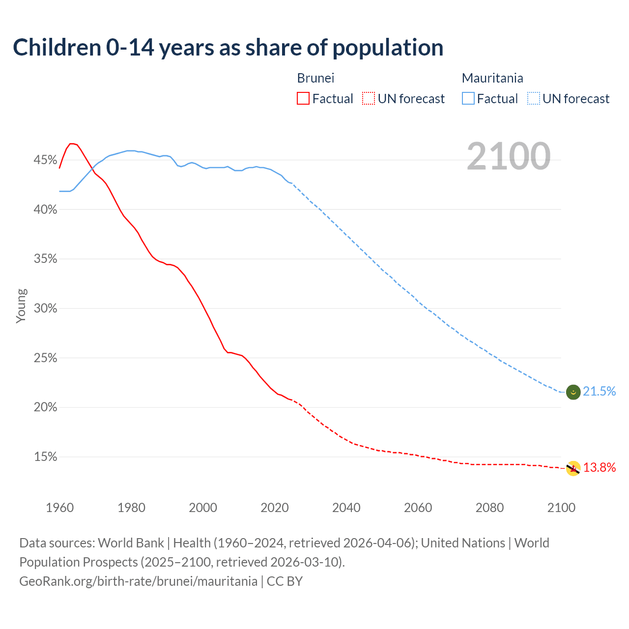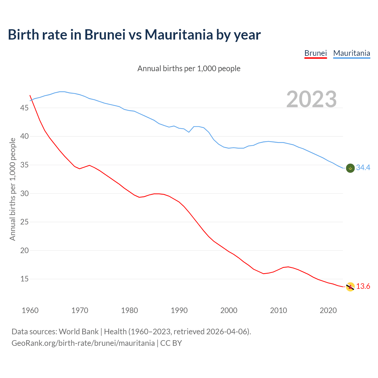 Brunei has an annual birth rate of 13.6 births per 1,000 people, compared to 34.4 for Mauritania. The average number of children a woman is expected to have during her lifetime — the fertility rate, is 1.75 in Brunei and 4.7 in Mauritania — 168.9% difference.