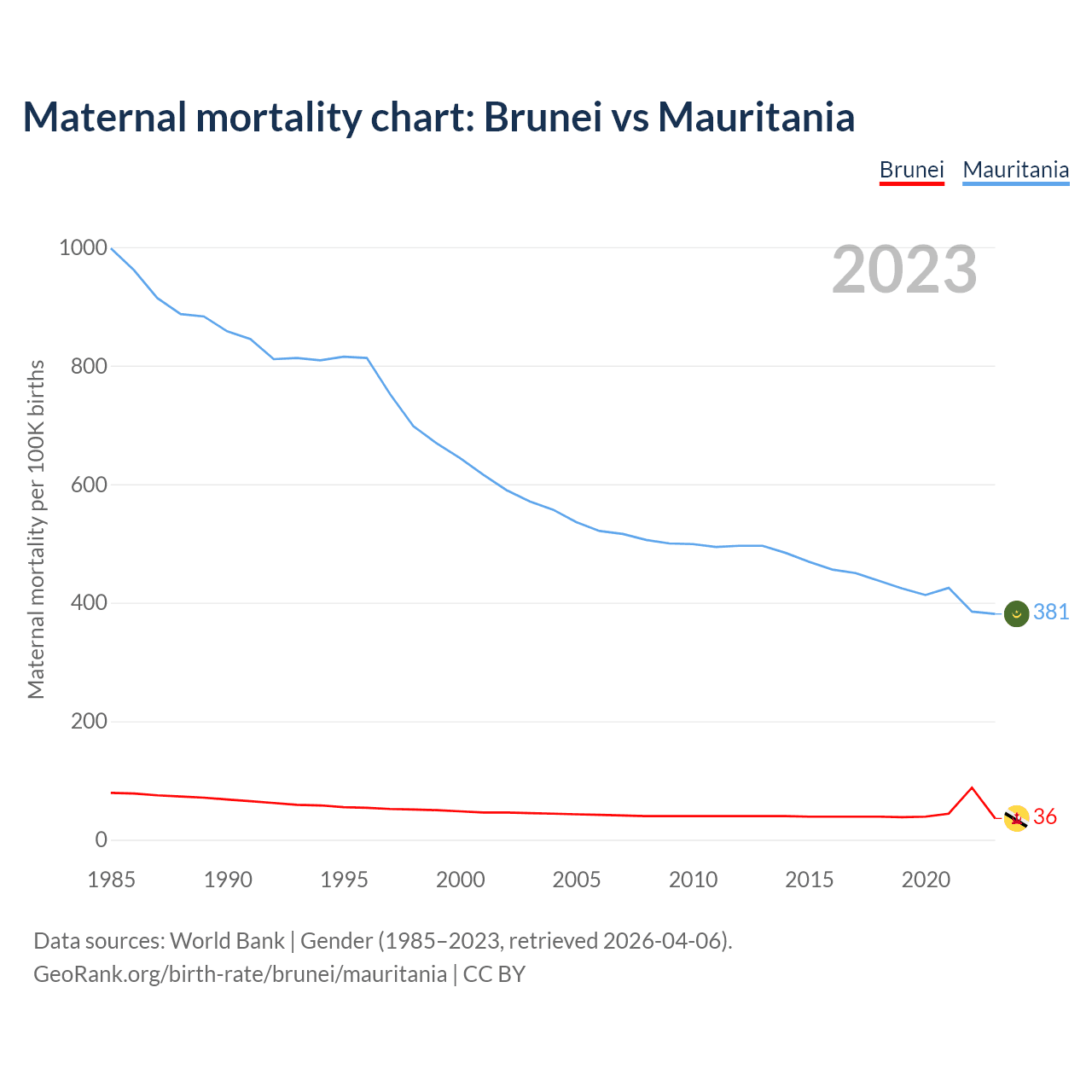 The maternal mortality rate, which is the probability of dying during childbirth or within 42 days of pregnancy termination, is 36 deaths per 100,000 live births in Brunei, compared to 381 deaths in Mauritania.