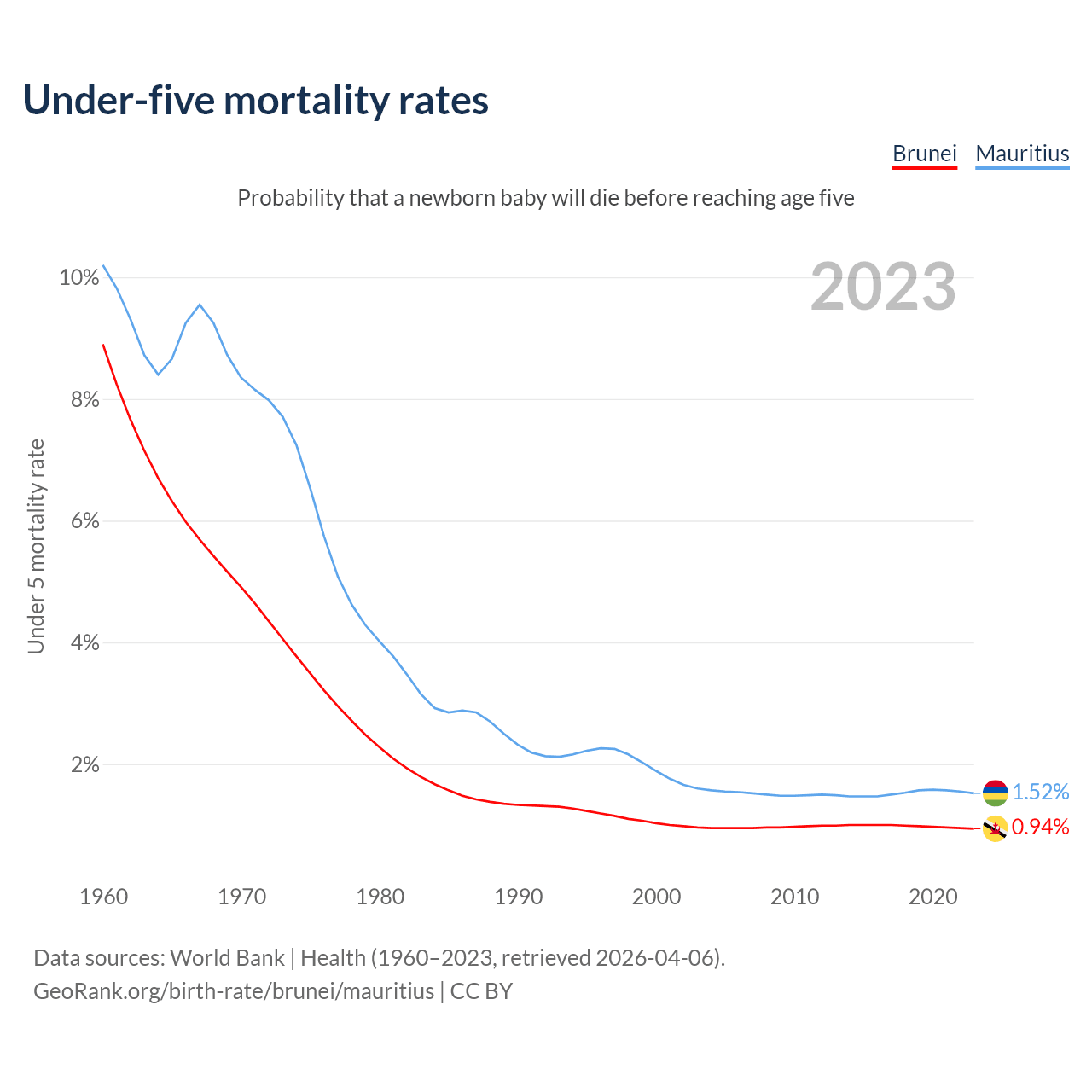 The chance that a newborn baby will die before reaching age five is 0.94% in Brunei and 1.52% in Mauritius. Above is a chart with historical data on under-five mortality rates.