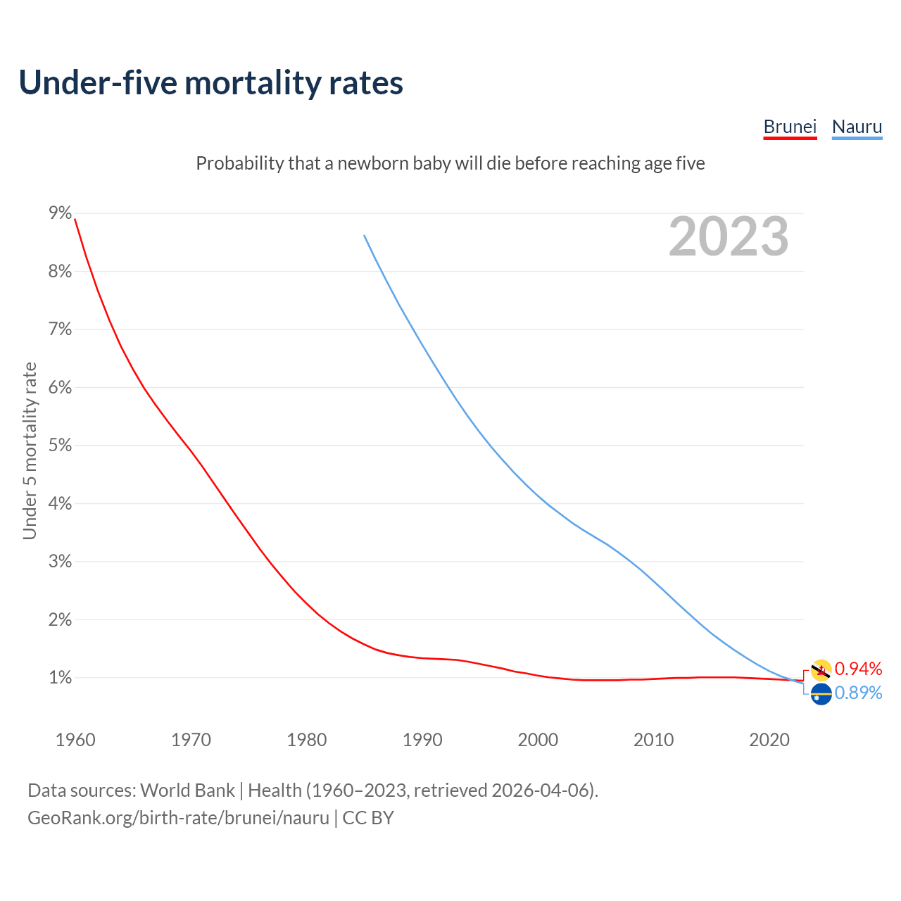 The chance that a newborn baby will die before reaching age five is 0.94% in Brunei and 0.89% in Nauru. Above is a chart with historical data on under-five mortality rates.