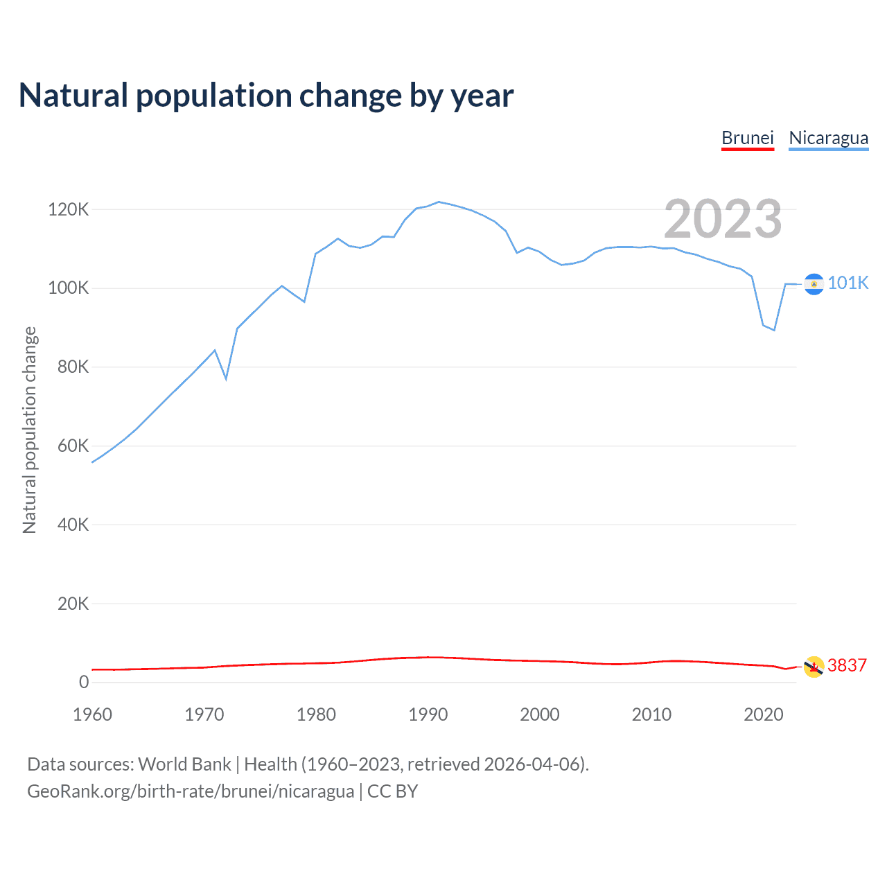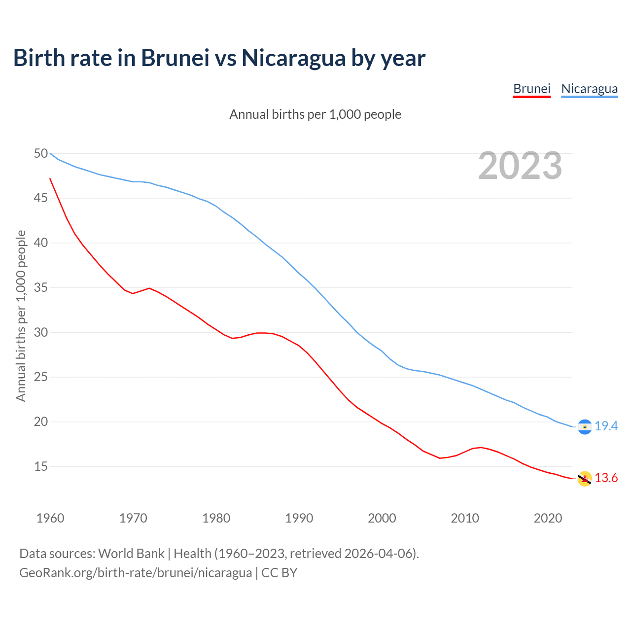 Brunei has an annual birth rate of 13.6 births per 1,000 people, compared to 19.4 for Nicaragua. The average number of children a woman is expected to have during her lifetime — the fertility rate, is 1.75 in Brunei and 2.22 in Nicaragua — 27% difference.