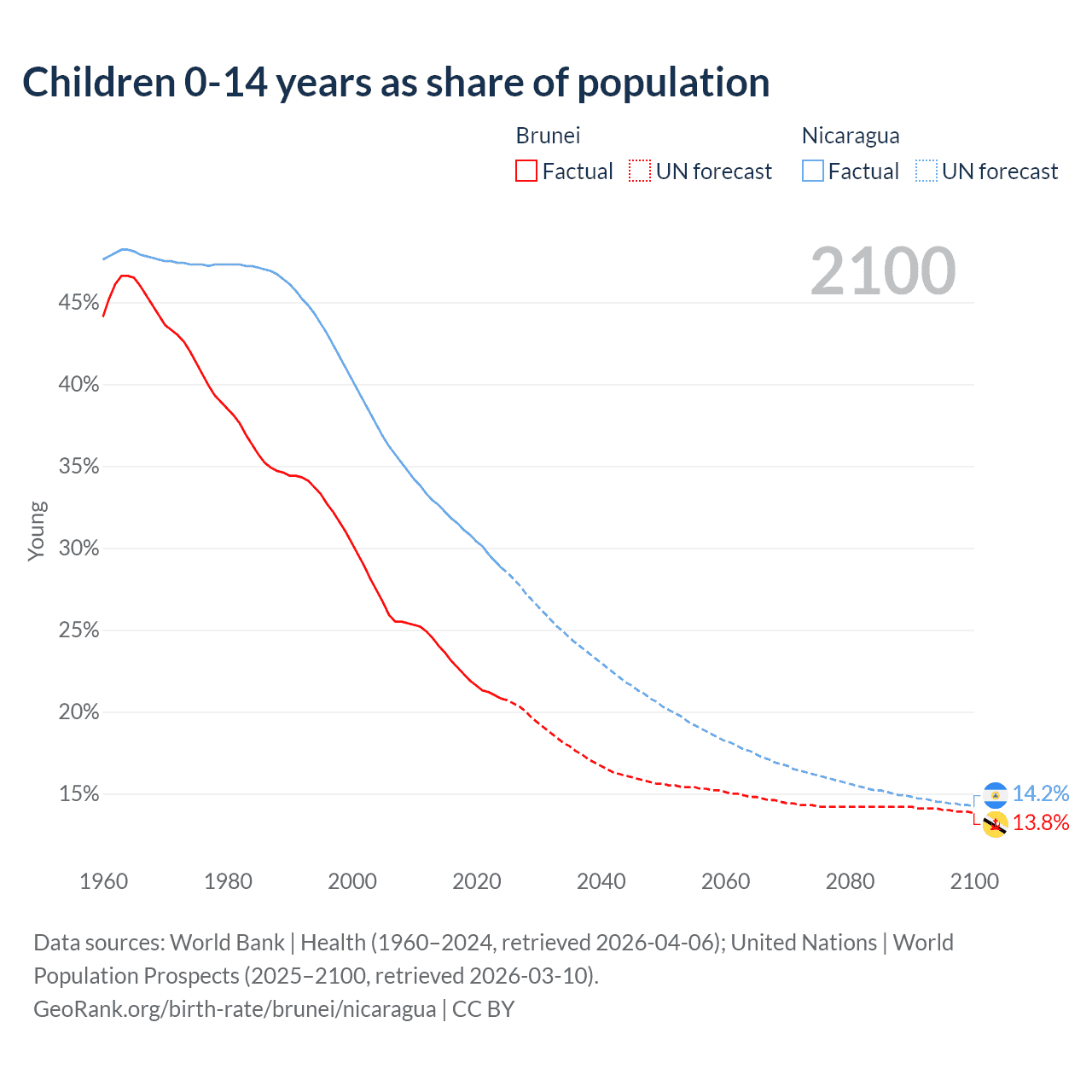 According to the latest available data on birth rates, the fertility rate in Brunei was 1.75 children per woman in 2023, compared to 2.22 in Nicaragua in 2023. The replacement level is considered to be 2.1 children per woman.