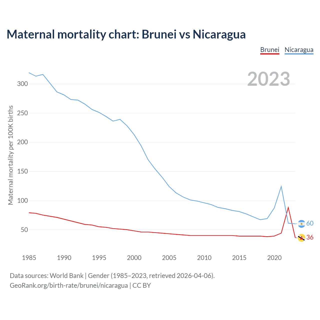 The maternal mortality rate, which is the probability of dying during childbirth or within 42 days of pregnancy termination, is 36 deaths per 100,000 live births in Brunei, compared to 60 deaths in Nicaragua.