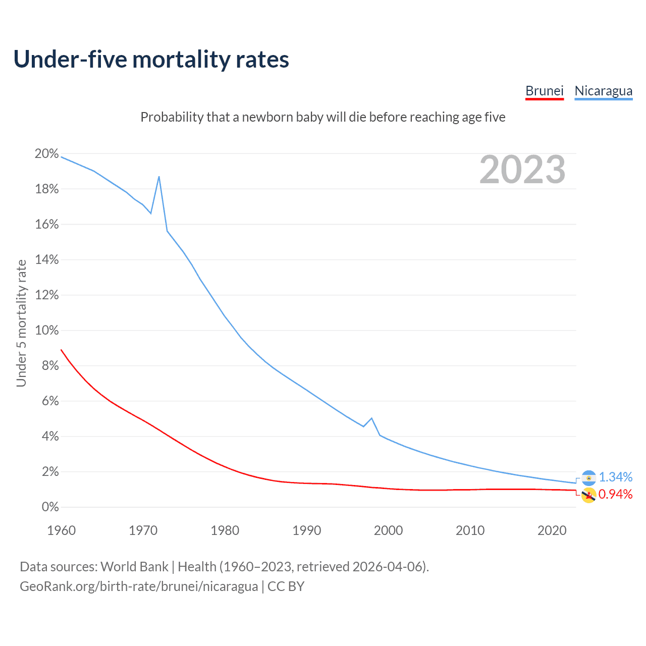 The chance that a newborn baby will die before reaching age five is 0.94% in Brunei and 1.34% in Nicaragua. Above is a chart with historical data on under-five mortality rates.