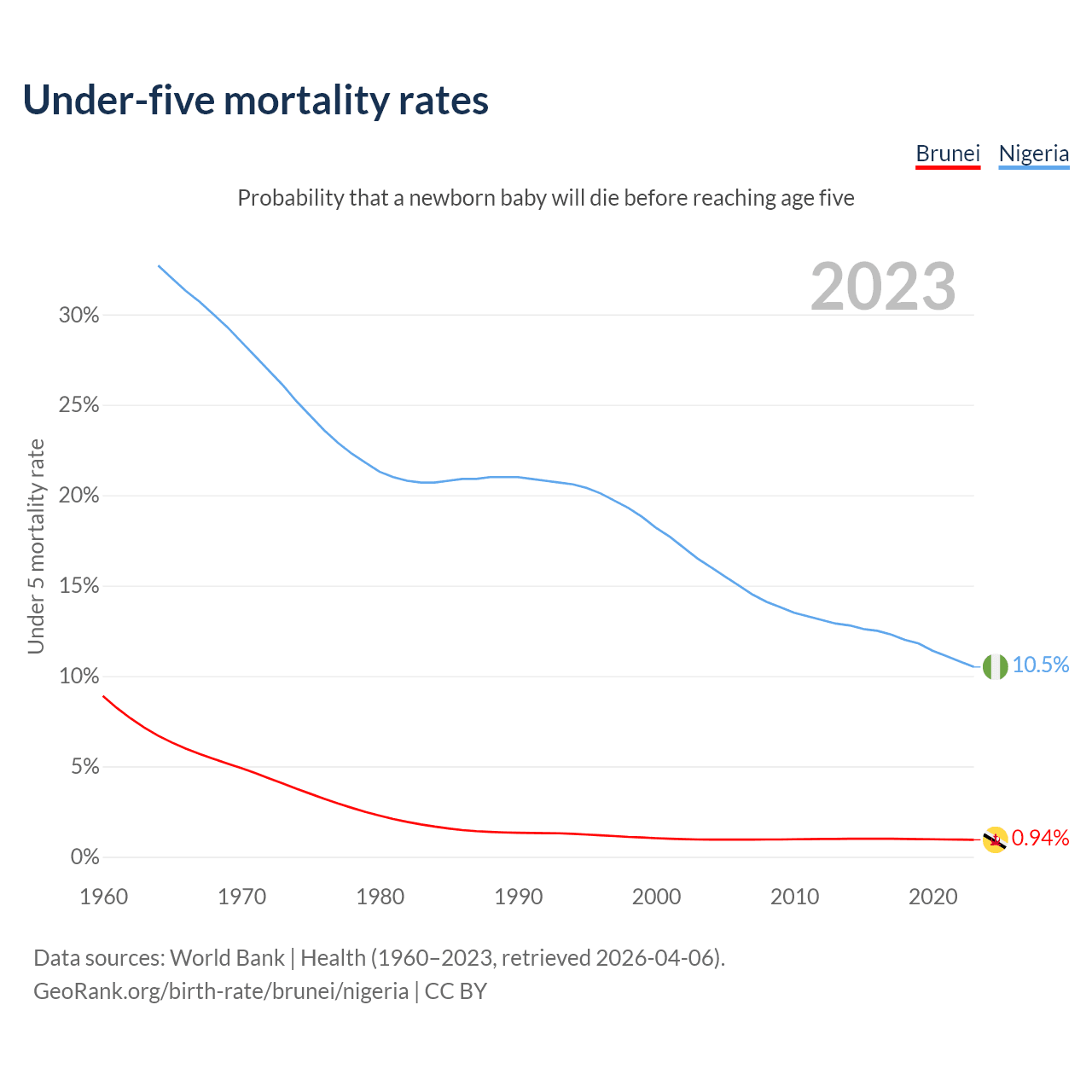 The chance that a newborn baby will die before reaching age five is 0.94% in Brunei and 10.5% in Nigeria. Above is a chart with historical data on under-five mortality rates.