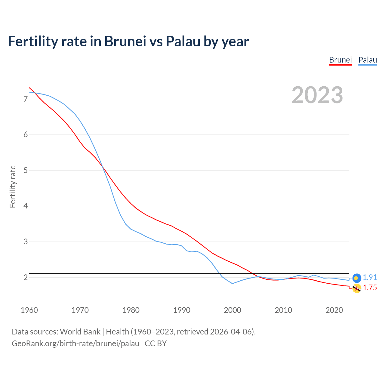 1960 vs 2023, the fertility rate has decreased by 76.1% in Brunei and by 73.5% in Palau — in 1960, it was 7.32 and 7.19, respectively.