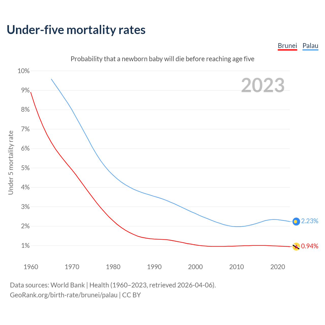 The chance that a newborn baby will die before reaching age five is 0.94% in Brunei and 2.23% in Palau. Above is a chart with historical data on under-five mortality rates.