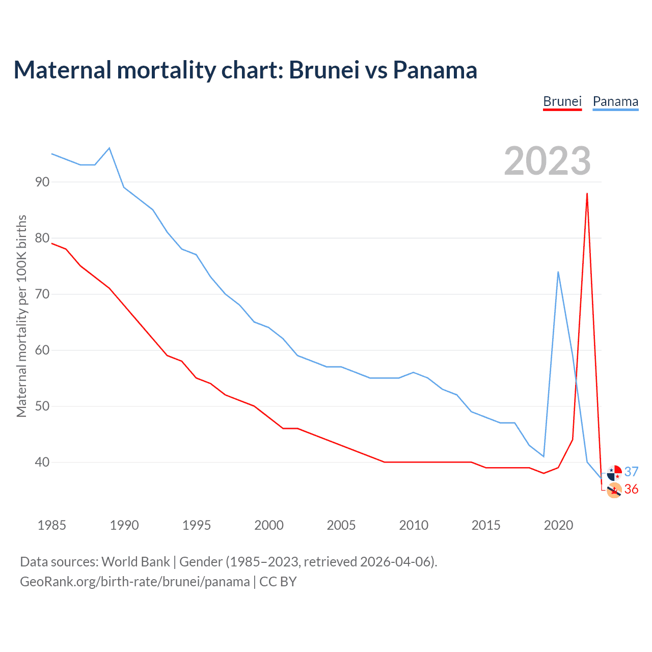 The maternal mortality rate, which is the probability of dying during childbirth or within 42 days of pregnancy termination, is 36 deaths per 100,000 live births in Brunei, compared to 37 deaths in Panama.