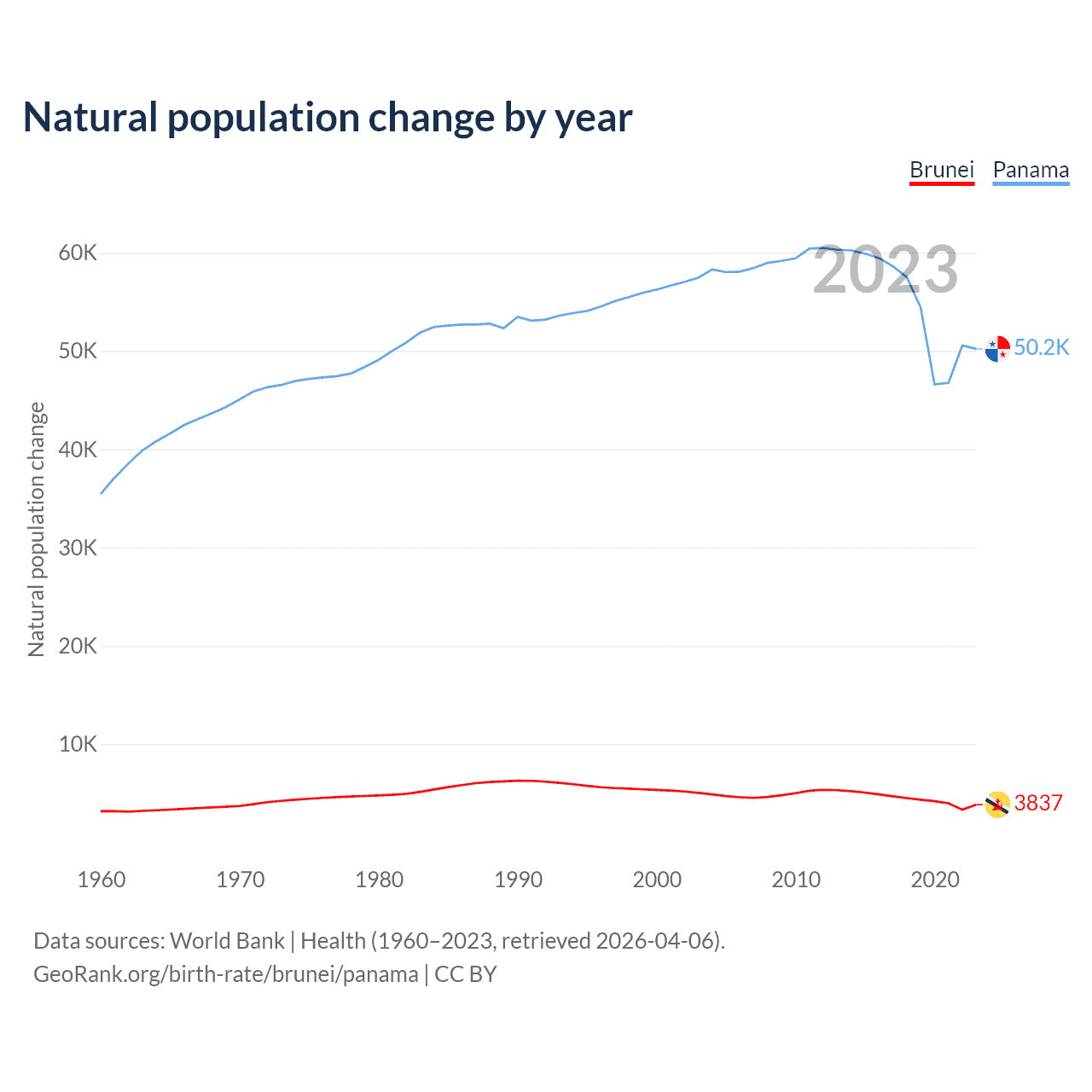 Brunei has an annual birth rate of 13.6 births per 1,000 people, compared to 16 for Panama. The average number of children a woman is expected to have during her lifetime — the fertility rate, is 1.75 in Brunei and 2.12 in Panama — 21.3% difference.