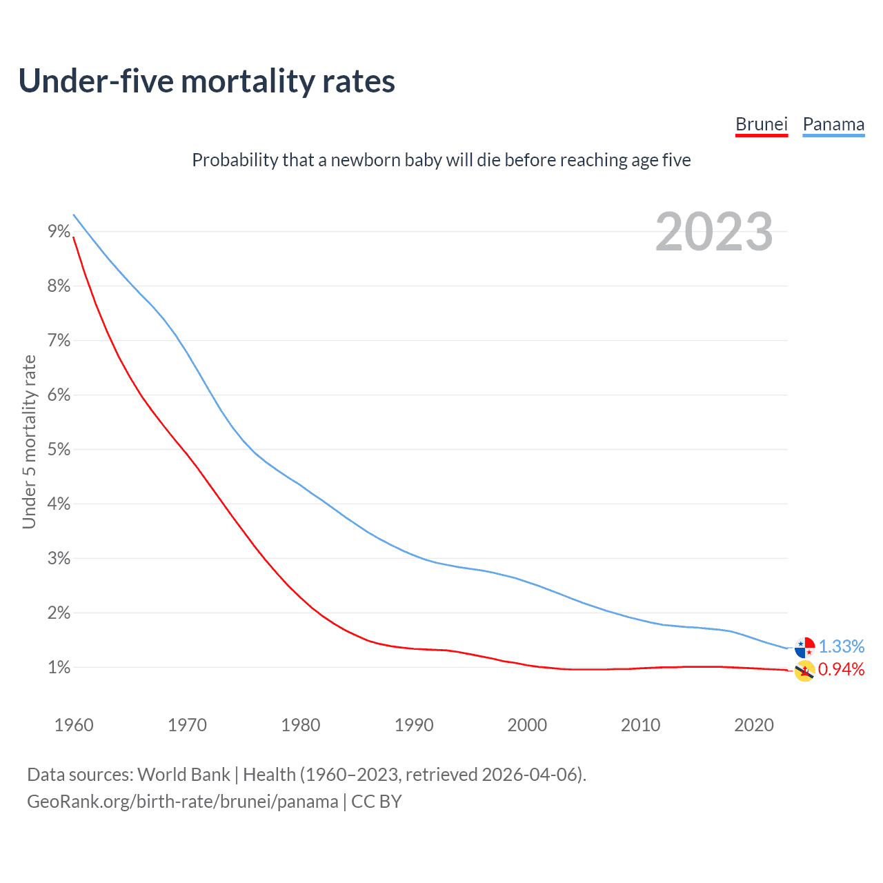 The chance that a newborn baby will die before reaching age five is 0.94% in Brunei and 1.33% in Panama. Above is a chart with historical data on under-five mortality rates.