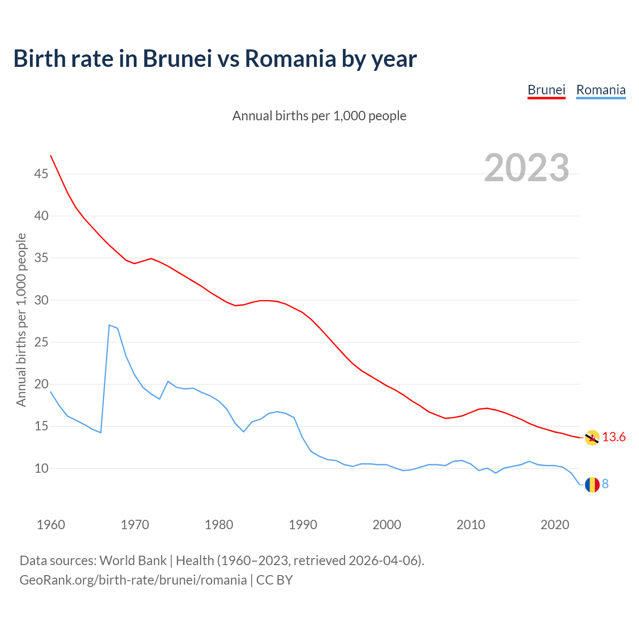 Brunei has an annual birth rate of 13.6 births per 1,000 people, compared to 8 for Romania. The average number of children a woman is expected to have during her lifetime — the fertility rate, is 1.75 in Brunei and 1.71 in Romania — 2.12% difference.