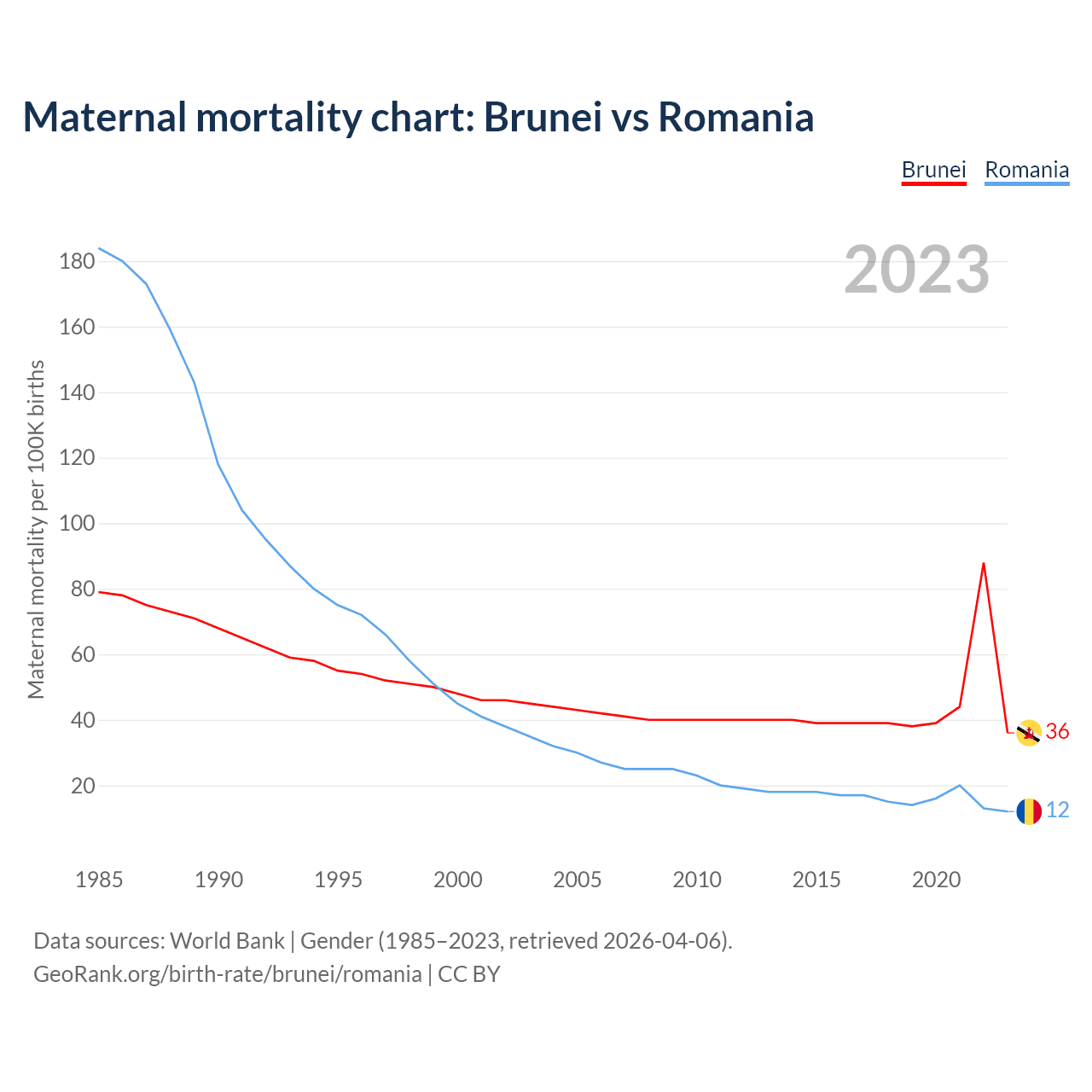 The maternal mortality rate, which is the probability of dying during childbirth or within 42 days of pregnancy termination, is 36 deaths per 100,000 live births in Brunei, compared to 12 deaths in Romania.