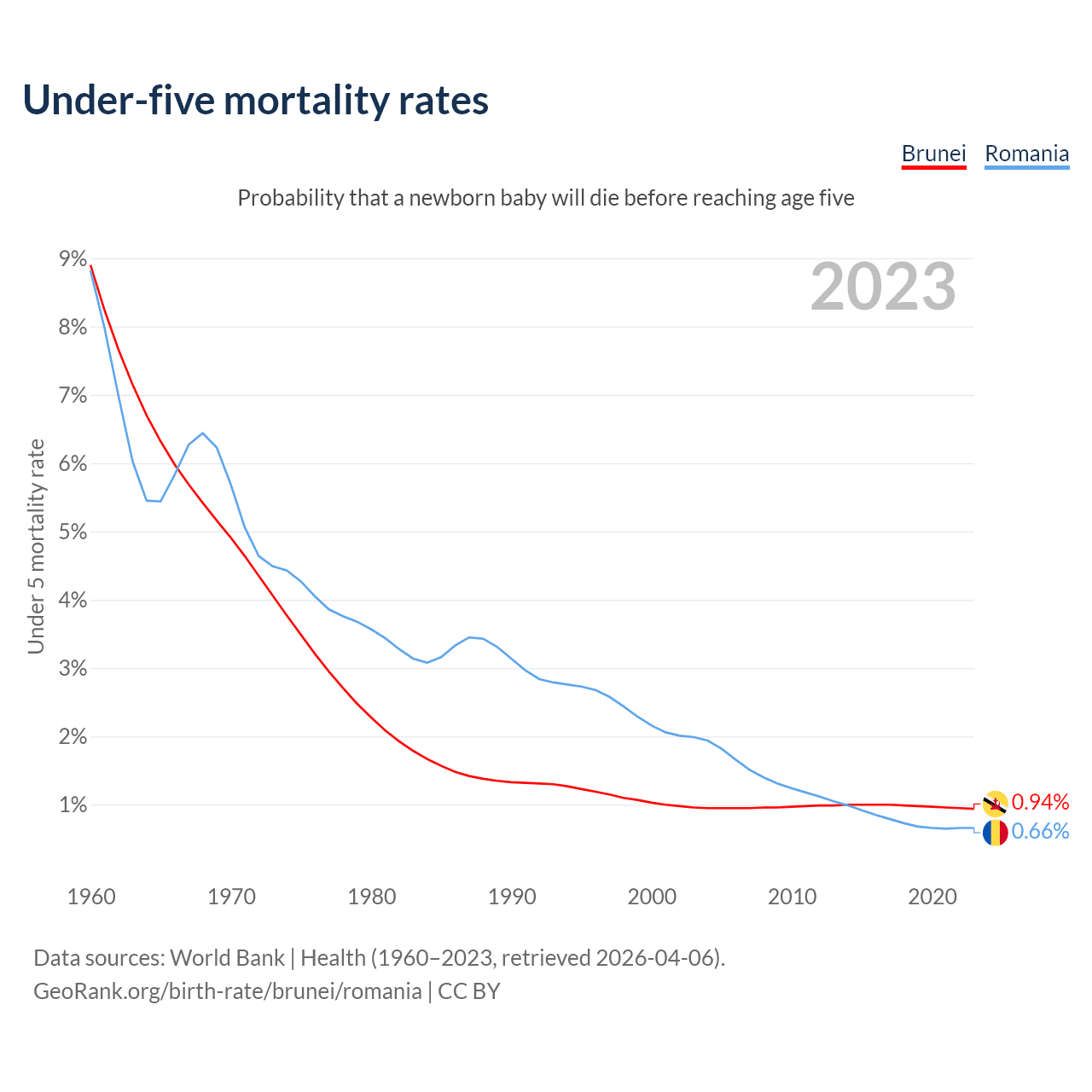 The chance that a newborn baby will die before reaching age five is 0.94% in Brunei and 0.66% in Romania. Above is a chart with historical data on under-five mortality rates.