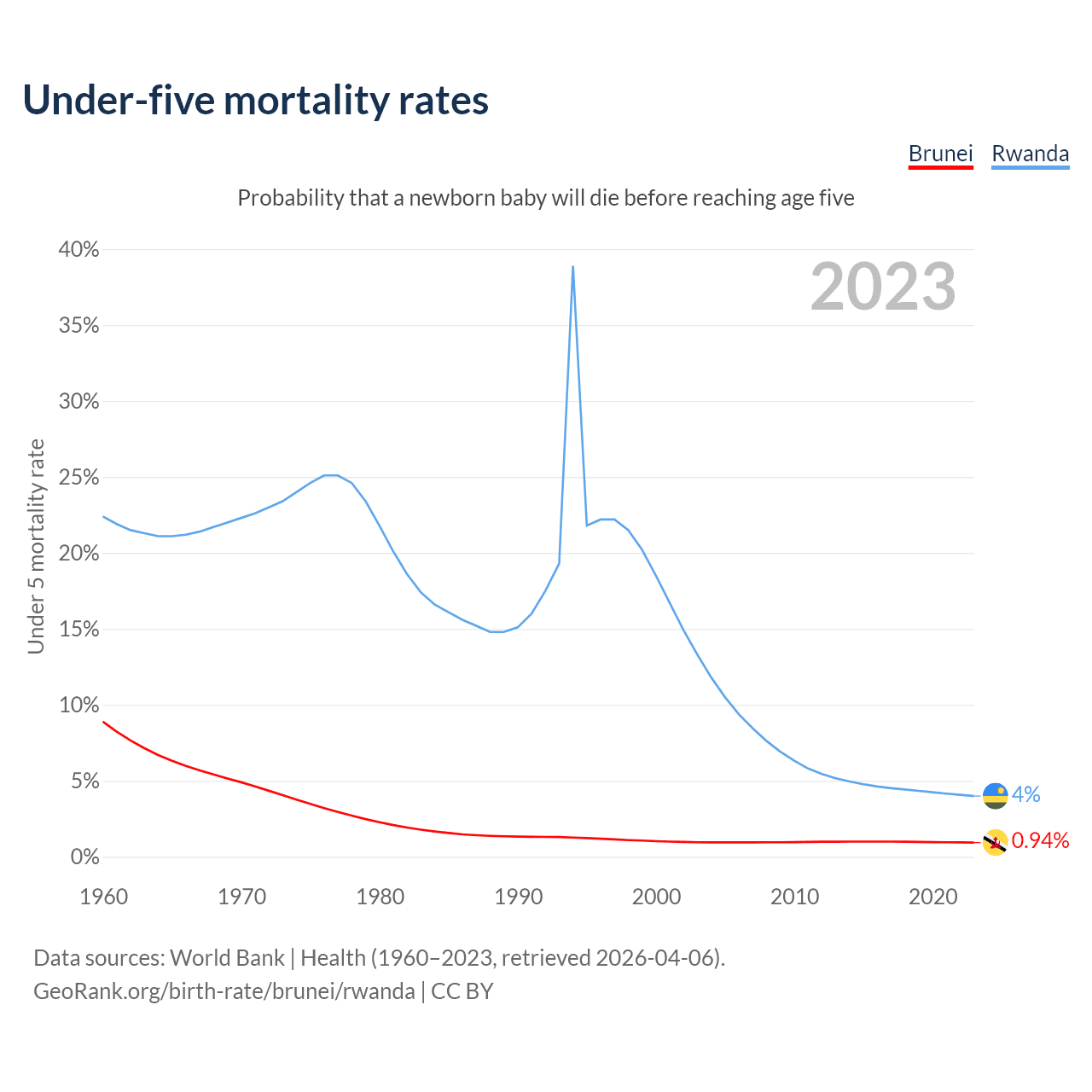 The chance that a newborn baby will die before reaching age five is 0.94% in Brunei and 4% in Rwanda. Above is a chart with historical data on under-five mortality rates.