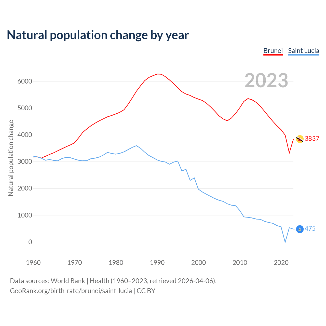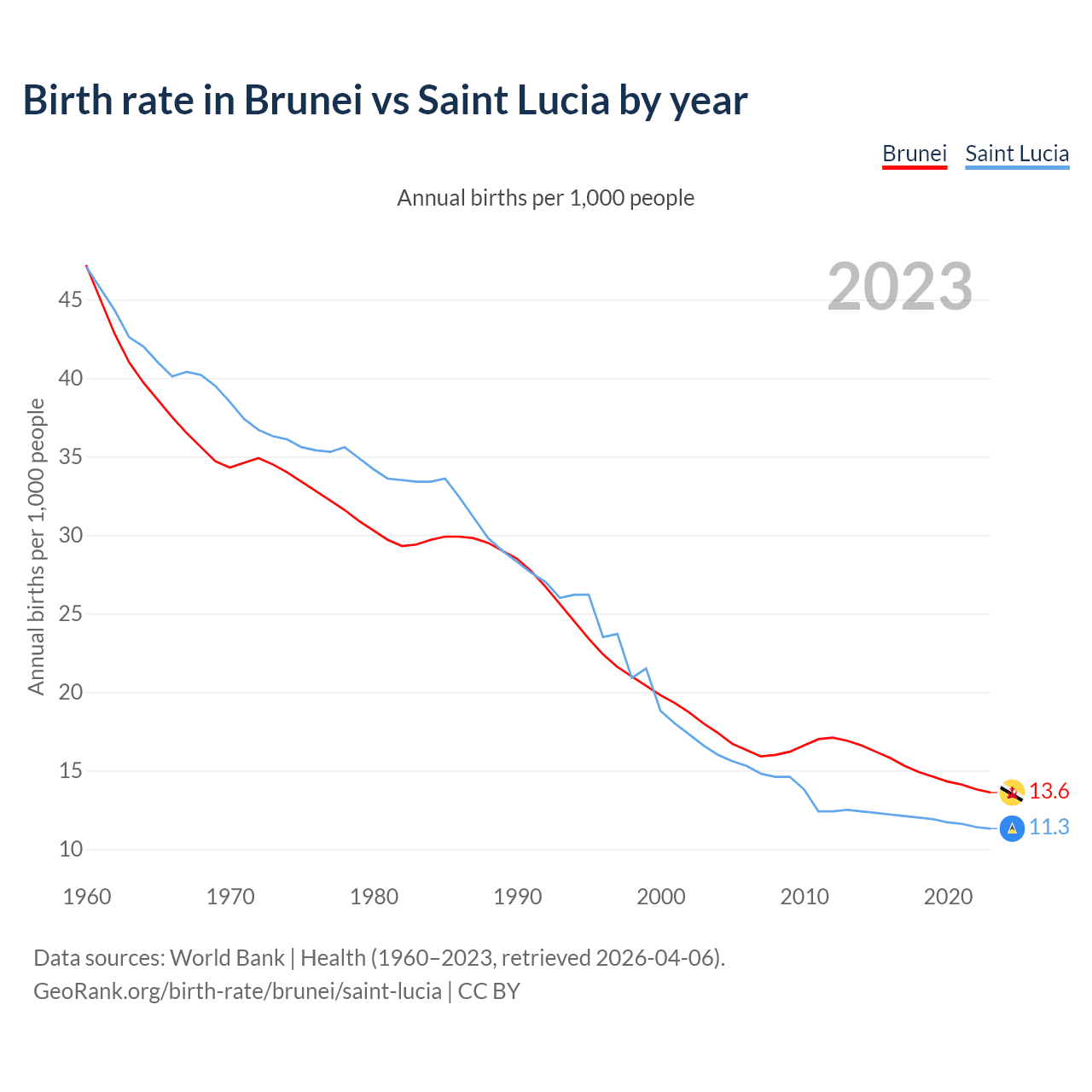 Brunei has an annual birth rate of 13.6 births per 1,000 people, compared to 11.3 for Saint Lucia. The average number of children a woman is expected to have during her lifetime — the fertility rate, is 1.75 in Brunei and 1.38 in Saint Lucia — 21.1% difference.