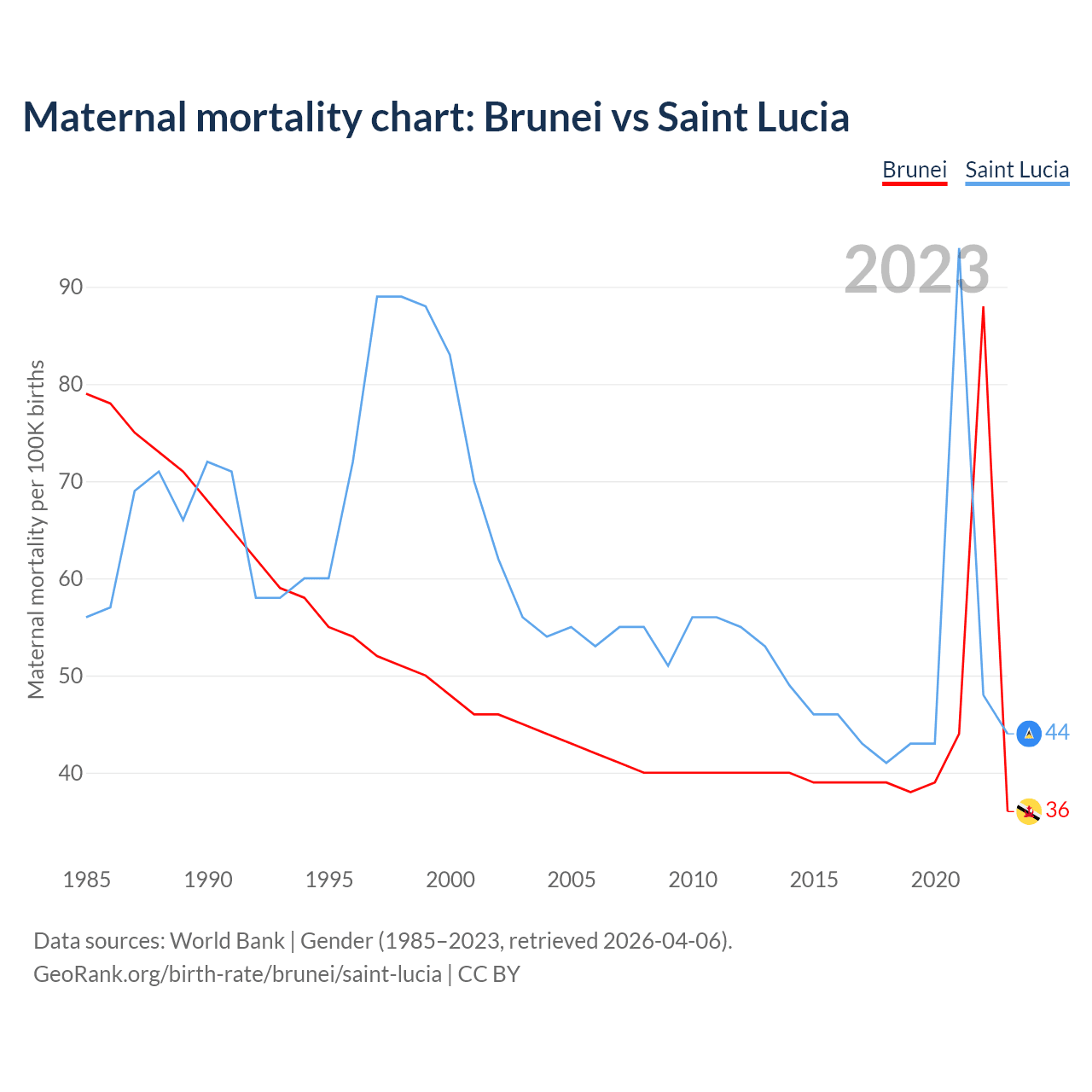 The maternal mortality rate, which is the probability of dying during childbirth or within 42 days of pregnancy termination, is 36 deaths per 100,000 live births in Brunei, compared to 44 deaths in Saint Lucia.