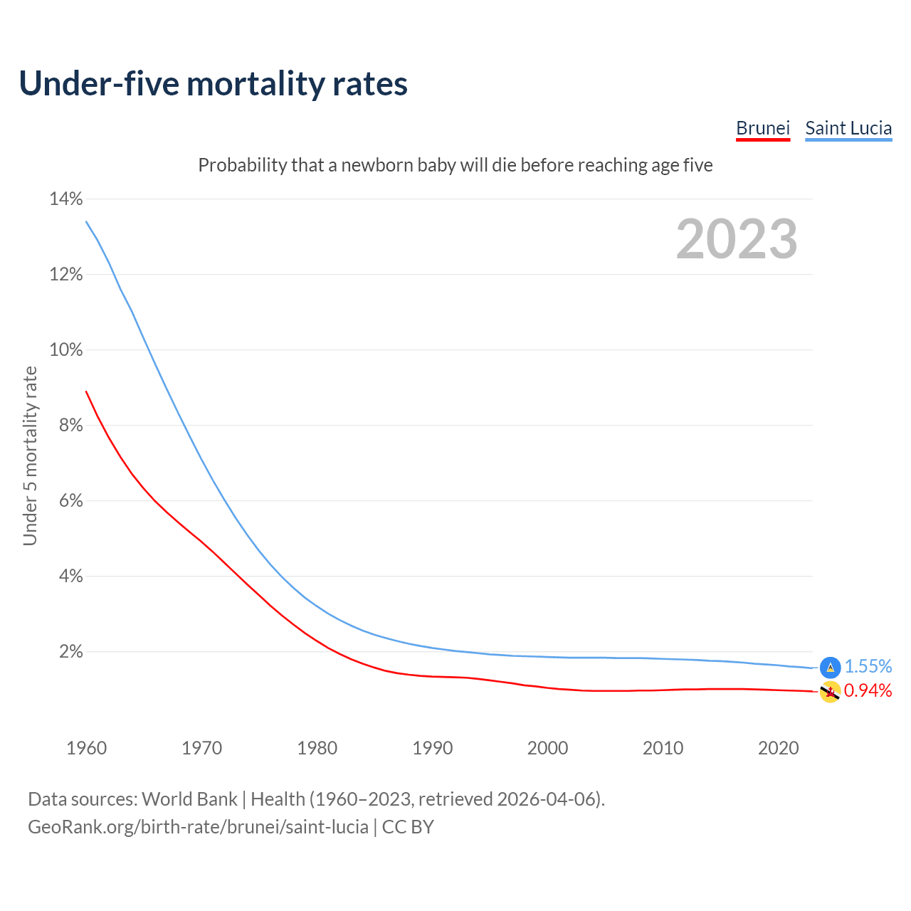 The chance that a newborn baby will die before reaching age five is 0.94% in Brunei and 1.55% in Saint Lucia. Above is a chart with historical data on under-five mortality rates.