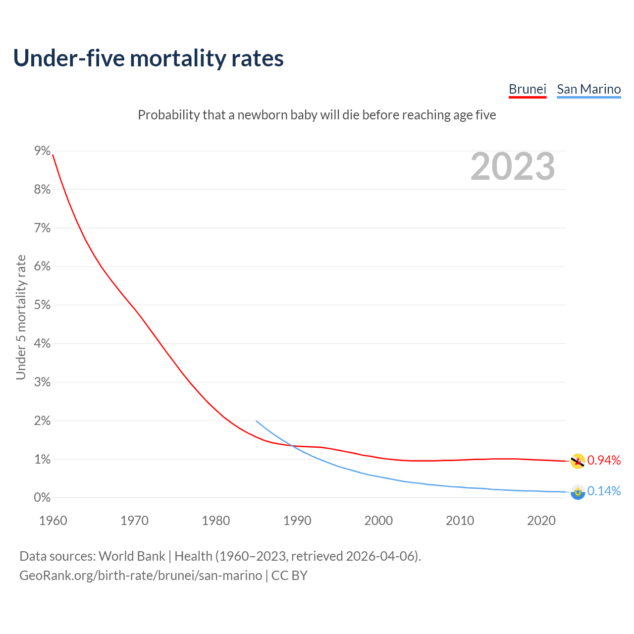The chance that a newborn baby will die before reaching age five is 0.94% in Brunei and 0.14% in San Marino. Above is a chart with historical data on under-five mortality rates.
