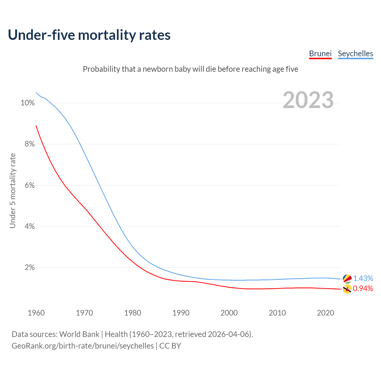 The chance that a newborn baby will die before reaching age five is 0.94% in Brunei and 1.43% in the Seychelles. Above is a chart with historical data on under-five mortality rates.